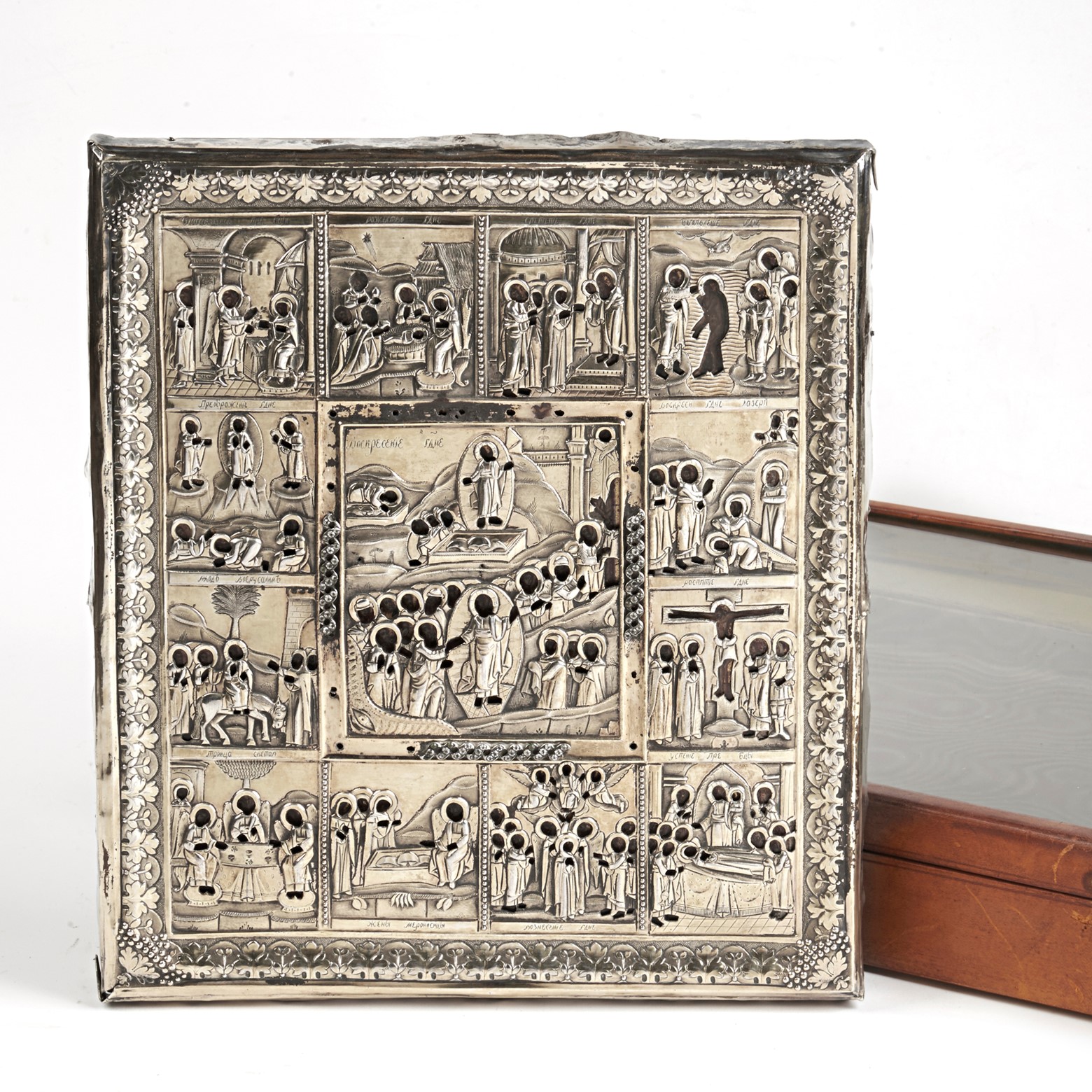 con riza in argento, cm 27x31, entro teca con sportello in vetro