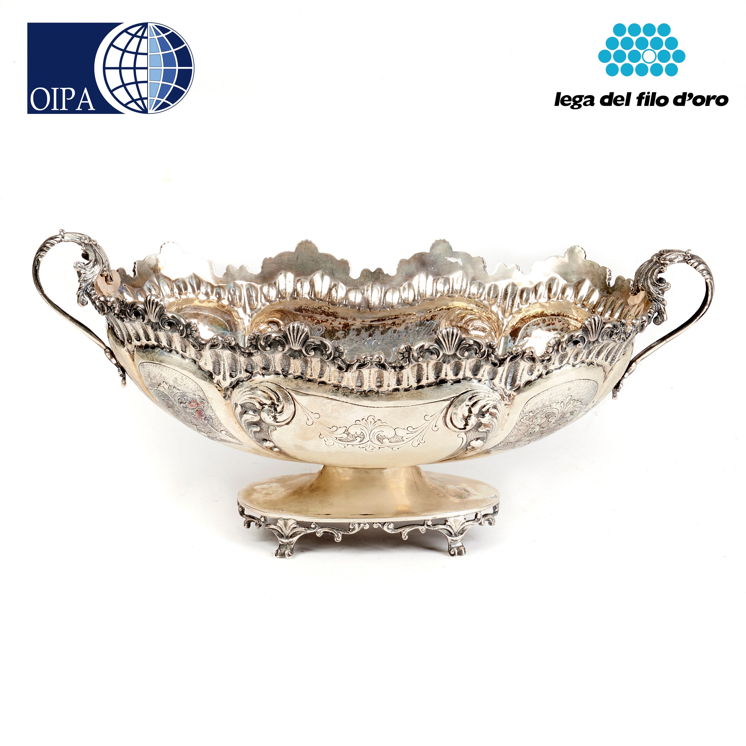 in argento sbalzato, cesellato e inciso, due anse a voluta, bordo sagomato e decorato a volute, corpo inciso a motivi vegetali, base ovale, poggiante su quattro piedini, cm 44x23x18, punzone 800, g 1630