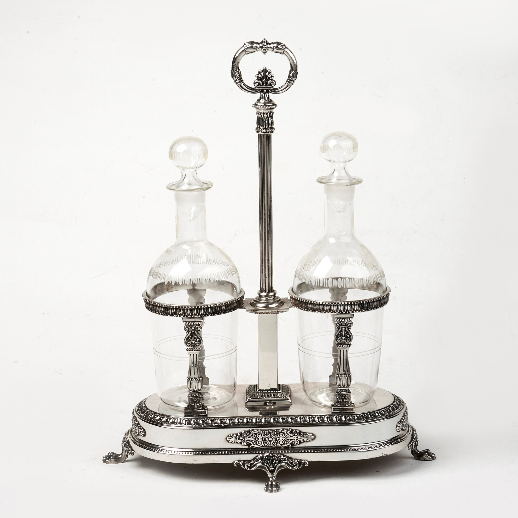 in argento, fusto a colonna, presa ad anello, corredato di due bottiglie, base ovale, cm 25, alt. cm 32, g 640
