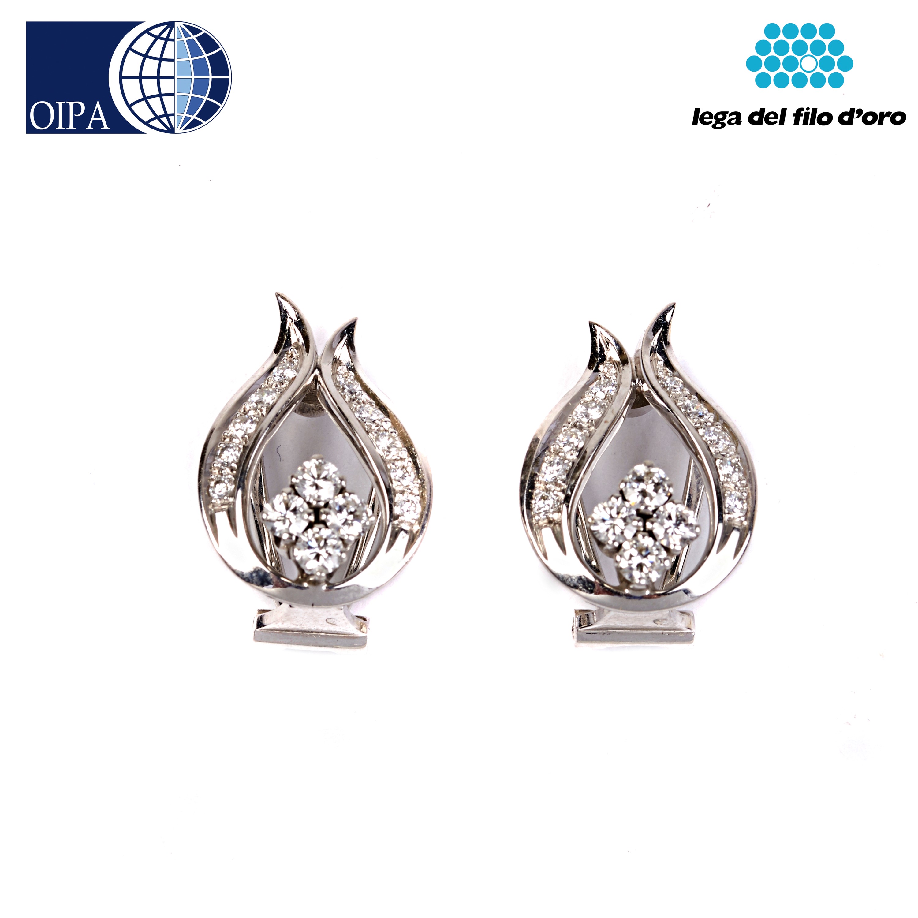 ciascuno realizzati a volute con quattro brillanti di circa ct 0,10 e linee decorate in piccoli brillanti, g 7,6 fermatura a clip