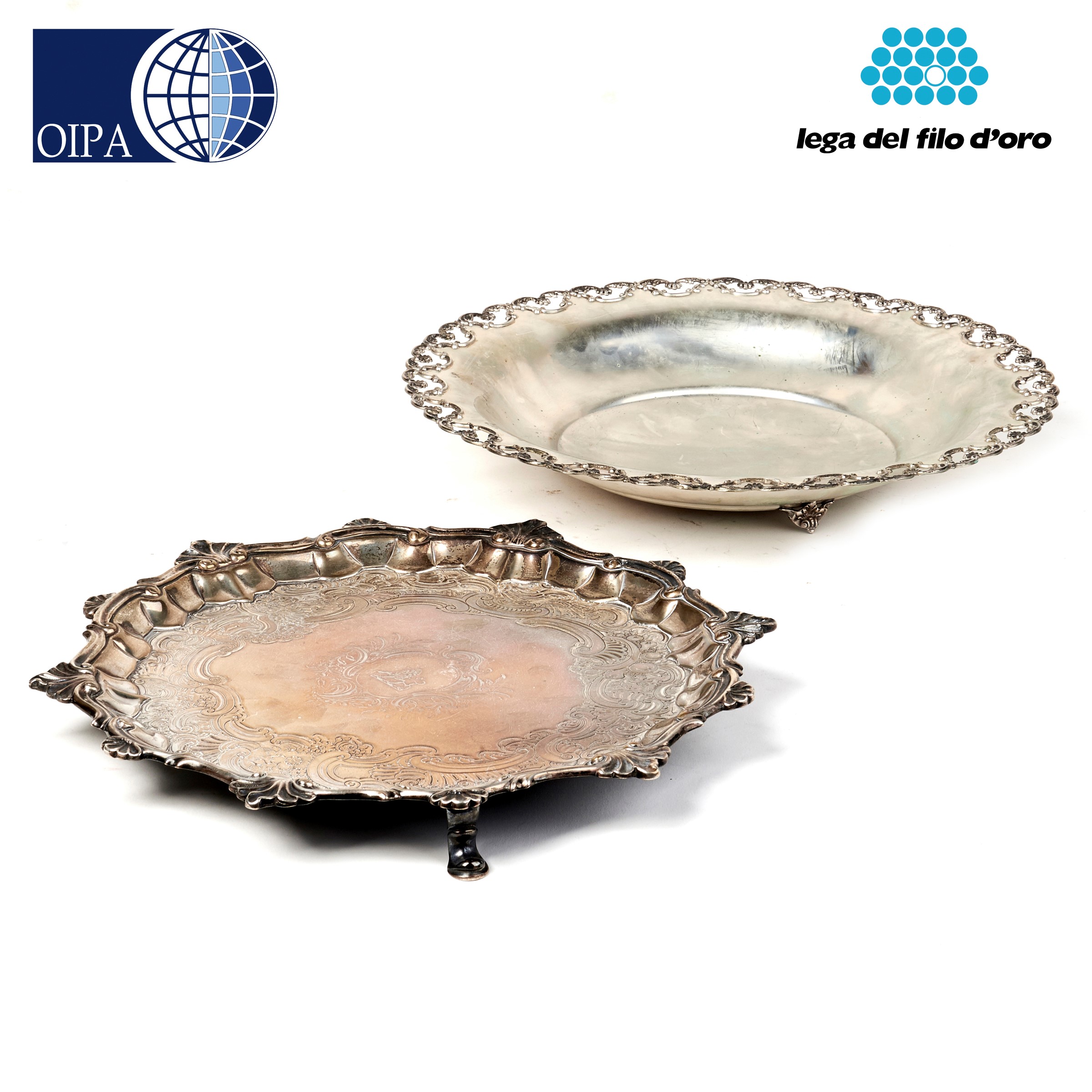 in argento cesellato, bordo traforato, diam. cm 30, punzone 800, g 400