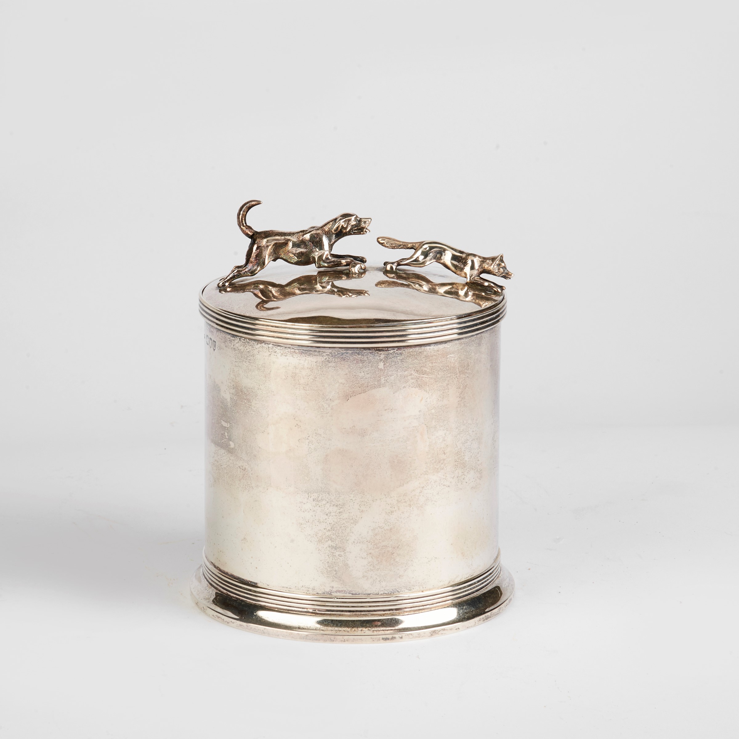 in argento sterling, presa del coperchio in forma di cane che rincorre una volpe, alt. cm 13, g 450. Reca etichetta incarta collezione Bulgari