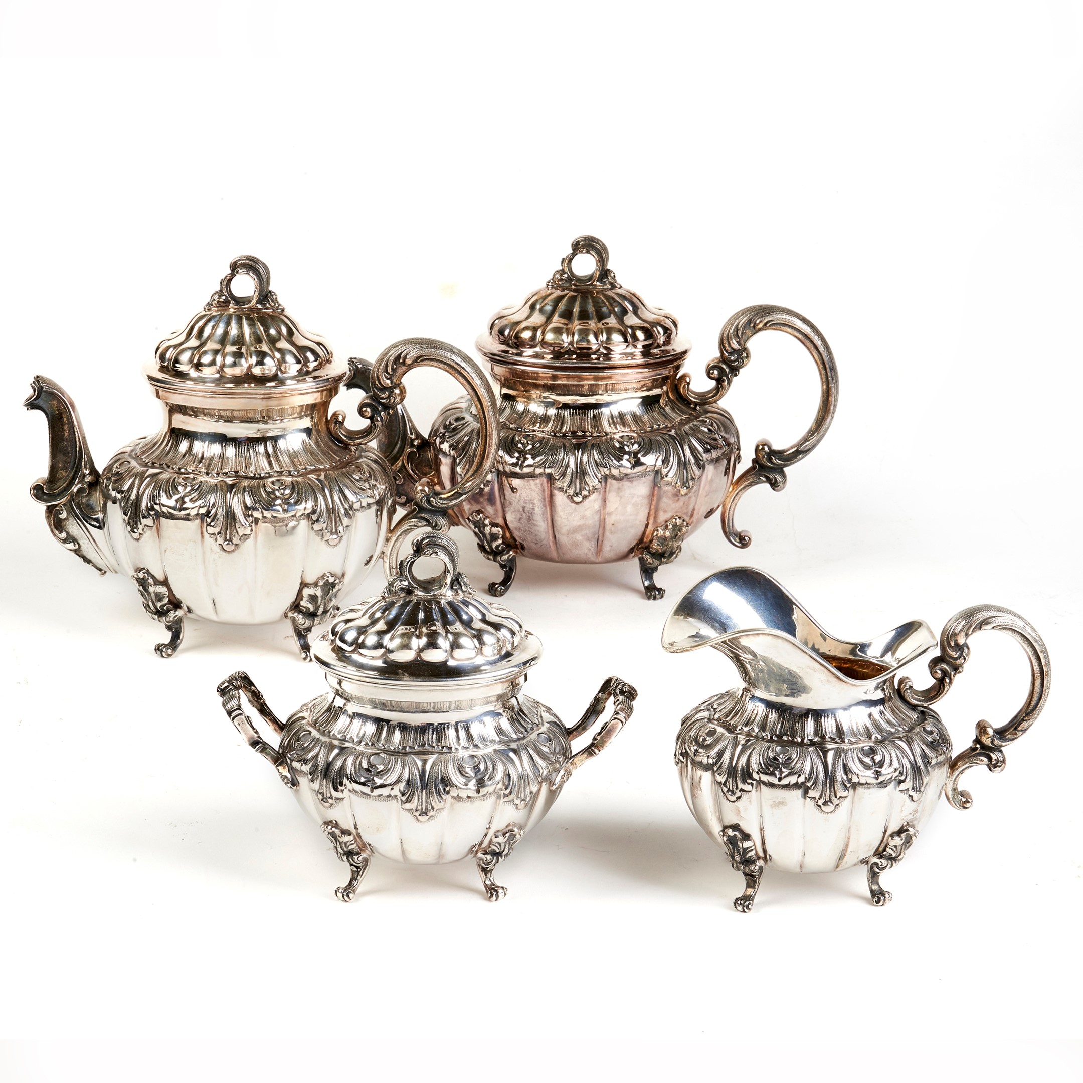 in argento sbalzato e cesellato, corpo scanalato e decorato a motivi vegetali, composto di quattro pezzi, manici a voluta, altezza massima cm 22, complessivi g 3150, punzone 800 e del fabbricante 110MI