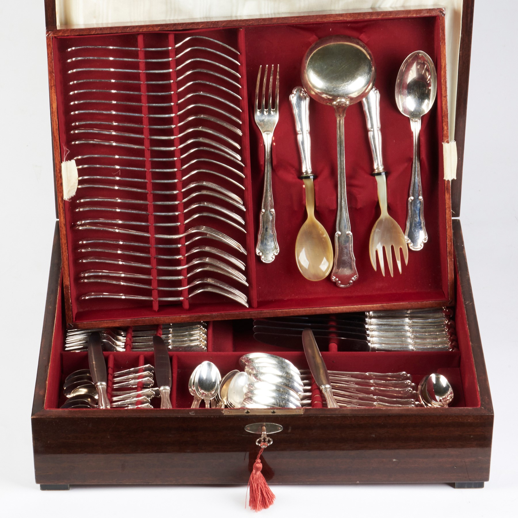 24 forchette, 12 cucchiai, 12 coltelli, 12 forchette dessert, 12 cucchiai dessert, 12 coltelli dessert, 12 cucchiaini caffè, 3 posate da servizio, punzone 800 e dei fabbricanti 29PD e 100PD entro scatola legno non pertinente.