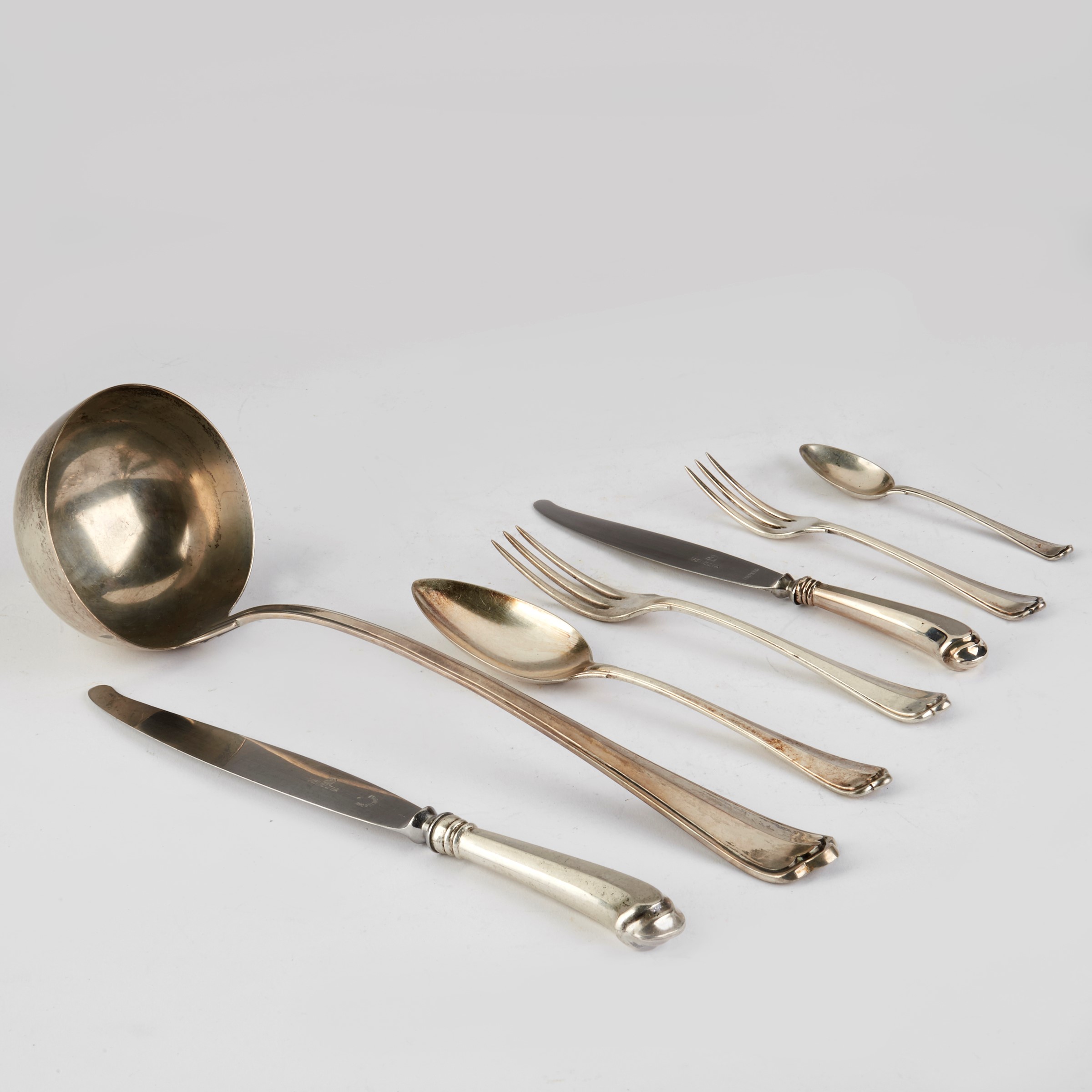 6 forchette, 6 cucchiai, 6 coltelli, 6 cucchiai frutta, 6 coltelli frutta, 6 cucchiaini caffè, 1 romaiolo