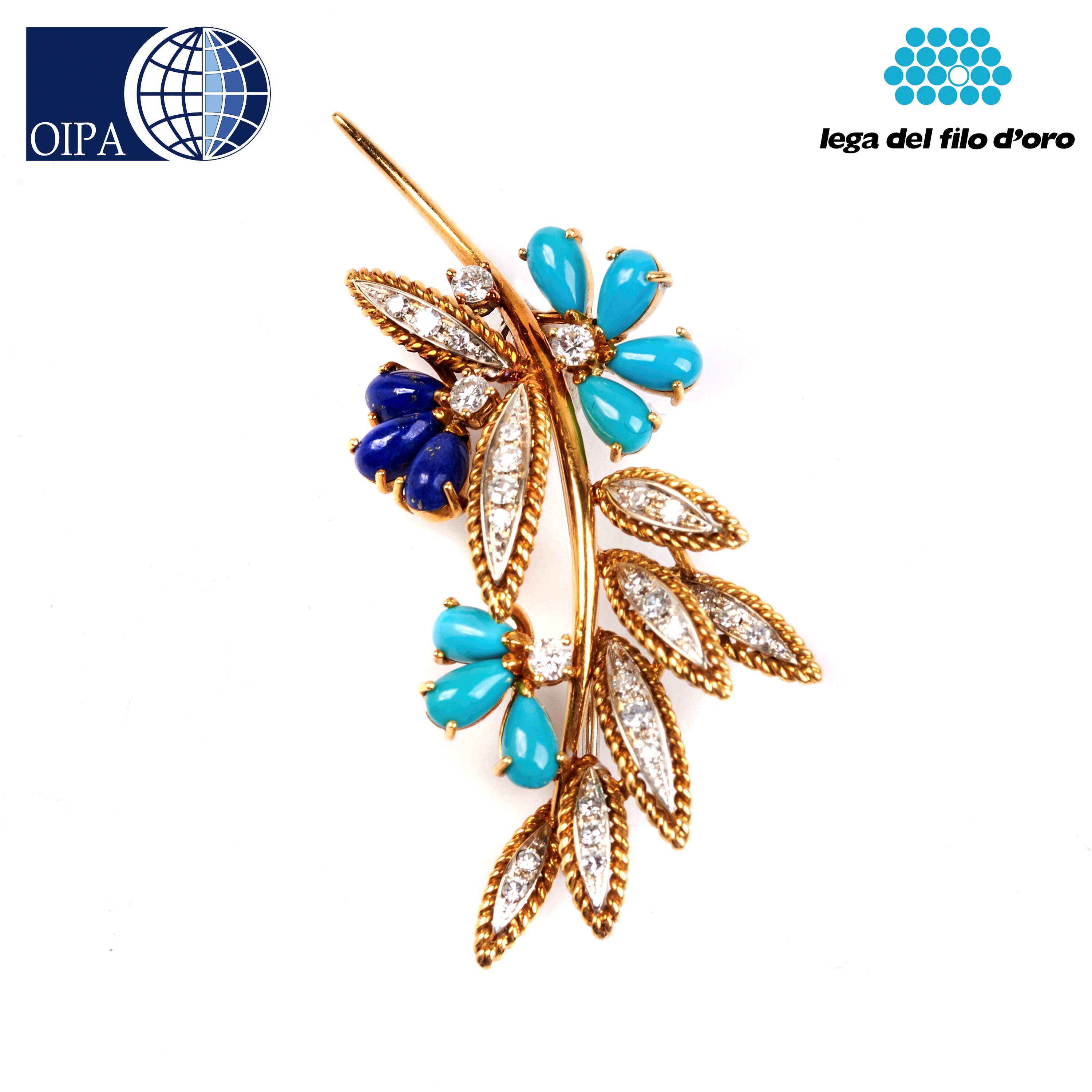 SPILLA IN ORO GIALLO, 18KT, DIAMANTI, TURCHESI E LAPISLAZZULI
