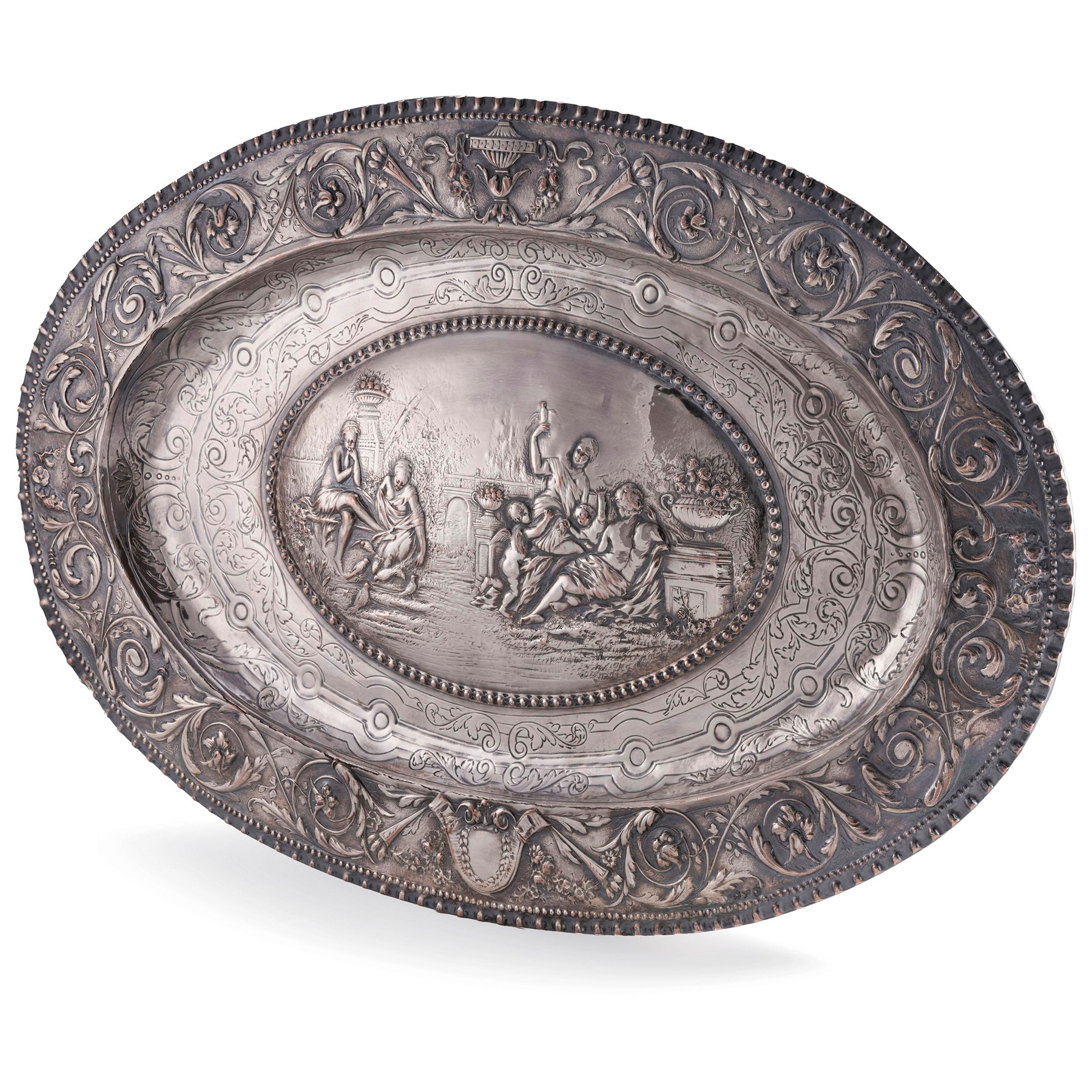 in rame argentato di forma ovale, al centro scena classica a sbalzo, ampia tesa in rame argentato decorata da volute di foglie, cm 53,5 danni