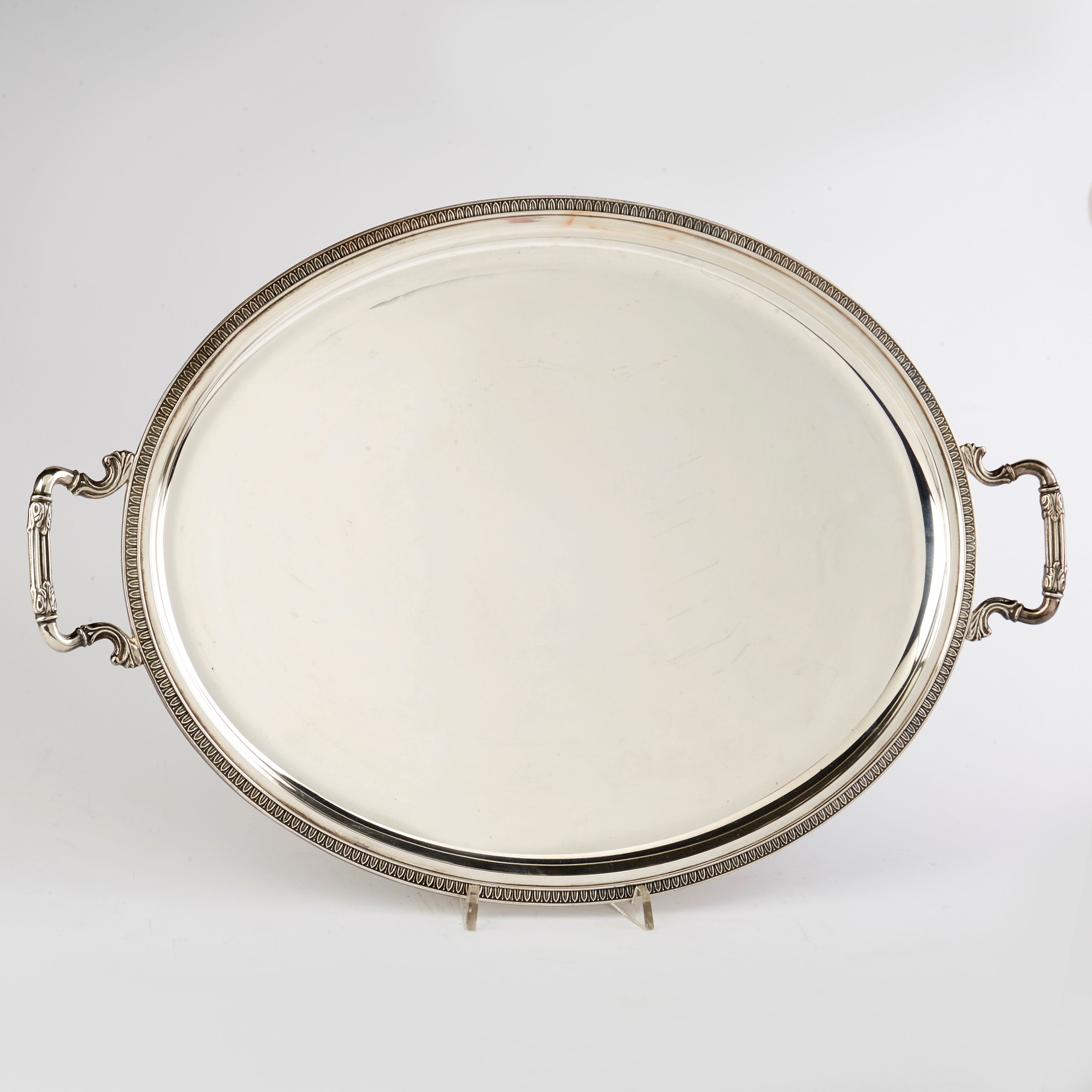 in argento di forma ovale, due anse, bordo decorato da foglie lanceolate, cm 49,5x32, g 790