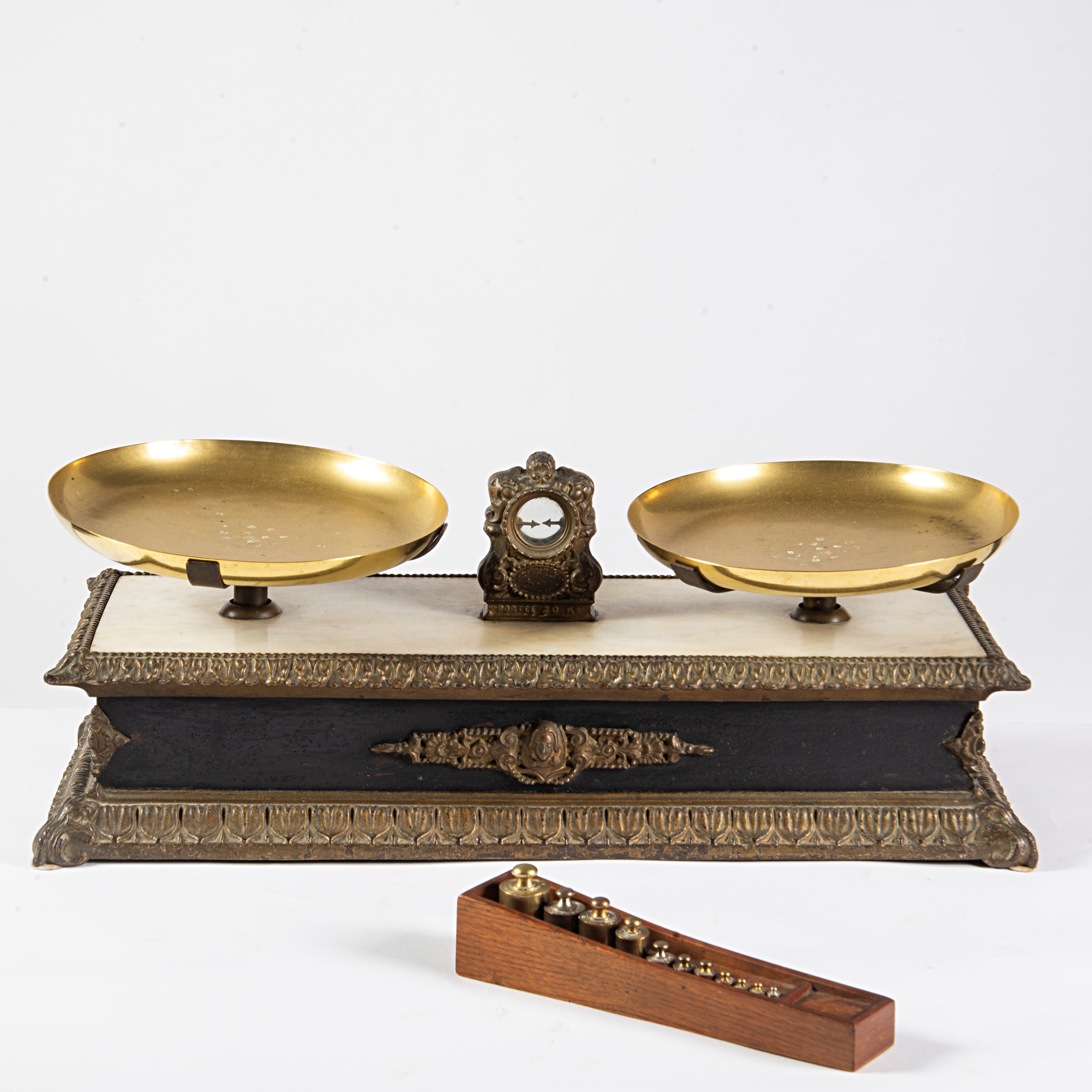 in legno ebanizzato e metallo dorato con due piatti in ottone, completa di pesi, cm L65xP26xH21