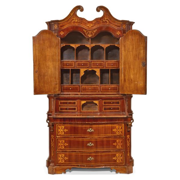 in legno lastronato e filettato con inserti in acero a ramages ad impreziosire fronte e fianchi; alzata a doppio sportello centinato, che all'interno nasconde diversi vani sagomati con cassettini sottostanti, sormontato da cimasa a doppia voluta; parte inferiore apribile a ribalta celante scarabattolo, con vano sagomato centrale affiancato da due cassetti per lato e piccolo piano a scorrimento, sottesa da tre cassetti; fianchi di linea leggermente mossa su piedi a mensola, cm 260x144x67