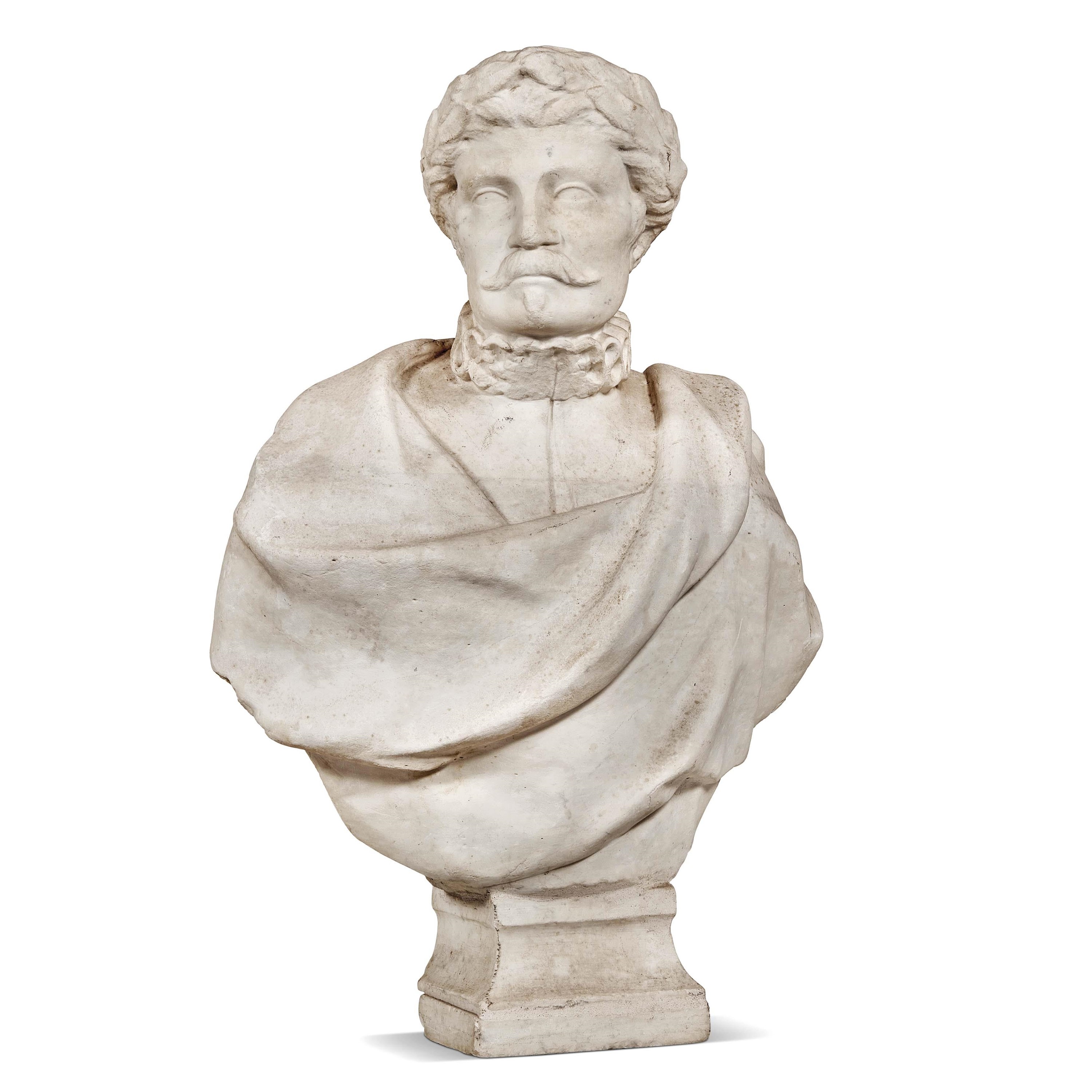 in marmo bianco raffigurante gentiluomo con baffi e gorgiera coperto da ampio mantello, su base a plinto, cm 88x60x25