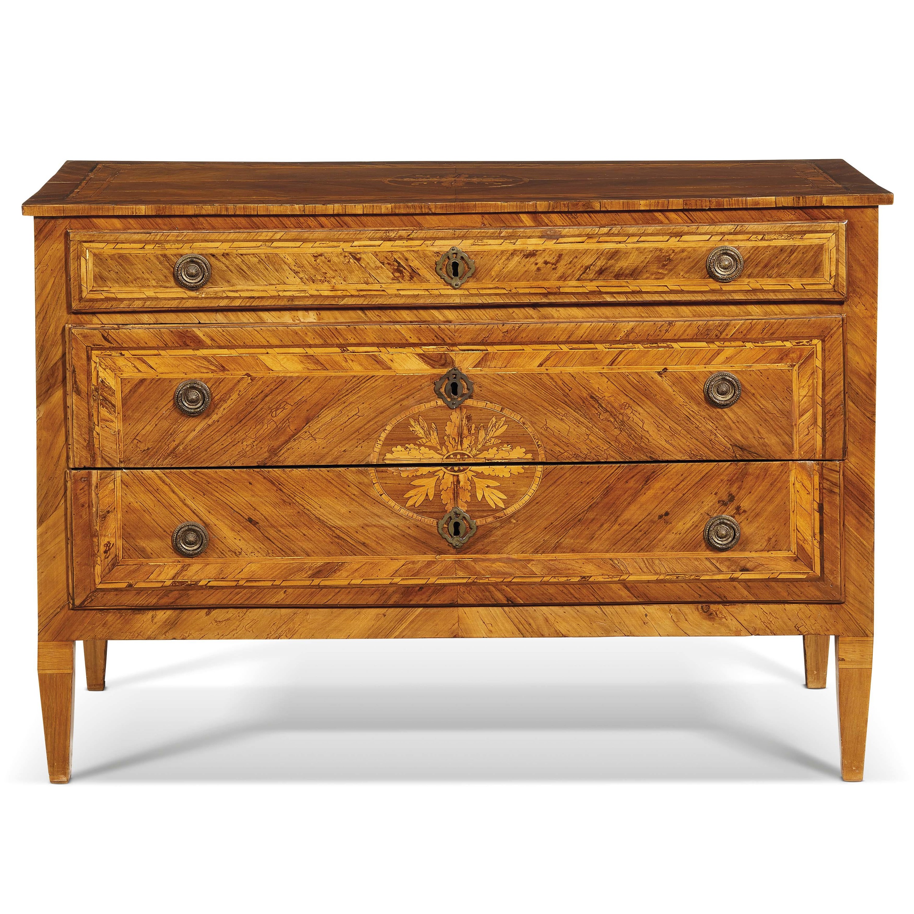 in noce intarsiato, fronte a tre cassetti, cm L117xP54xH82, difetti