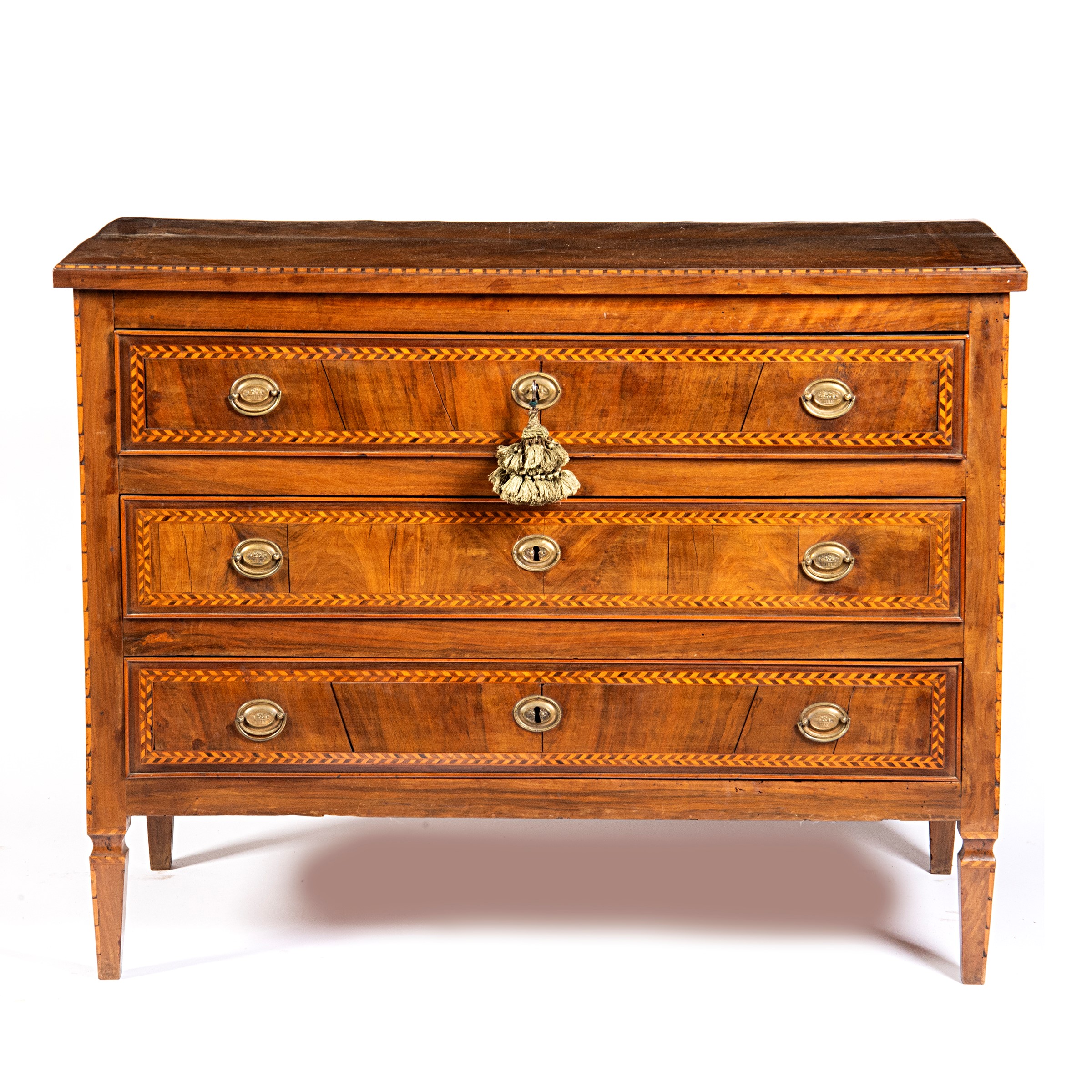 in noce intarsiato, tre cassetti, piedi a spillo, cm L120xP58xH92