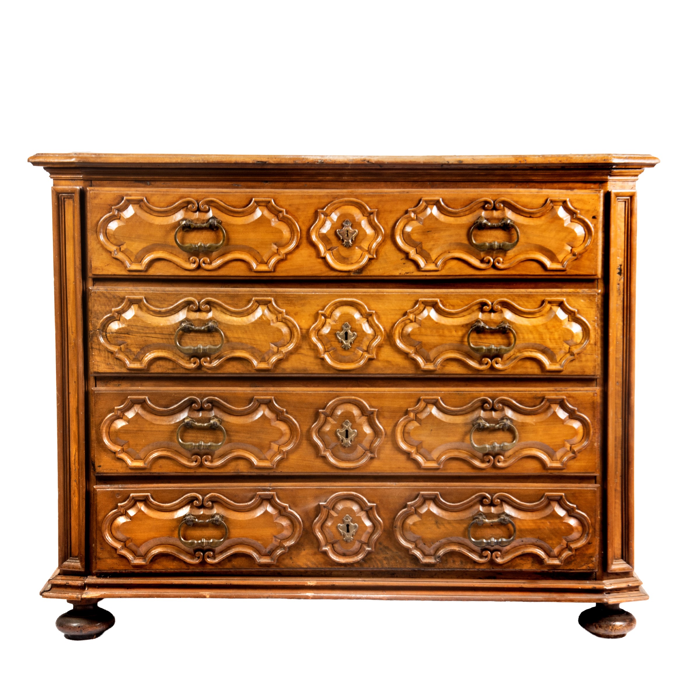 in noce, a quattro cassetti, parti intagliate, cm L147xP62xH115 difetti
