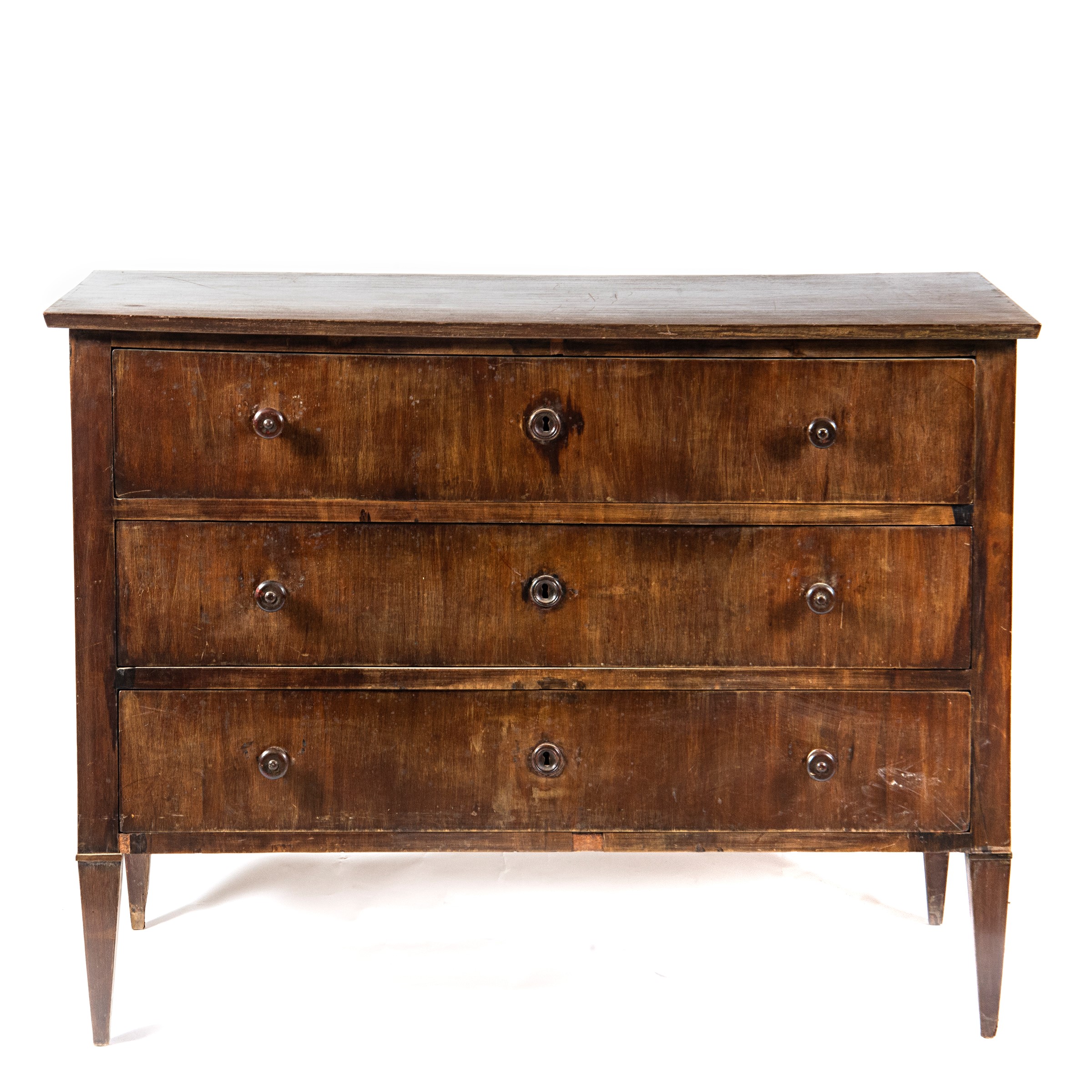 in noce con piano in mogano di epoca posteriore, tre cassetti, cm L128xP60xH94