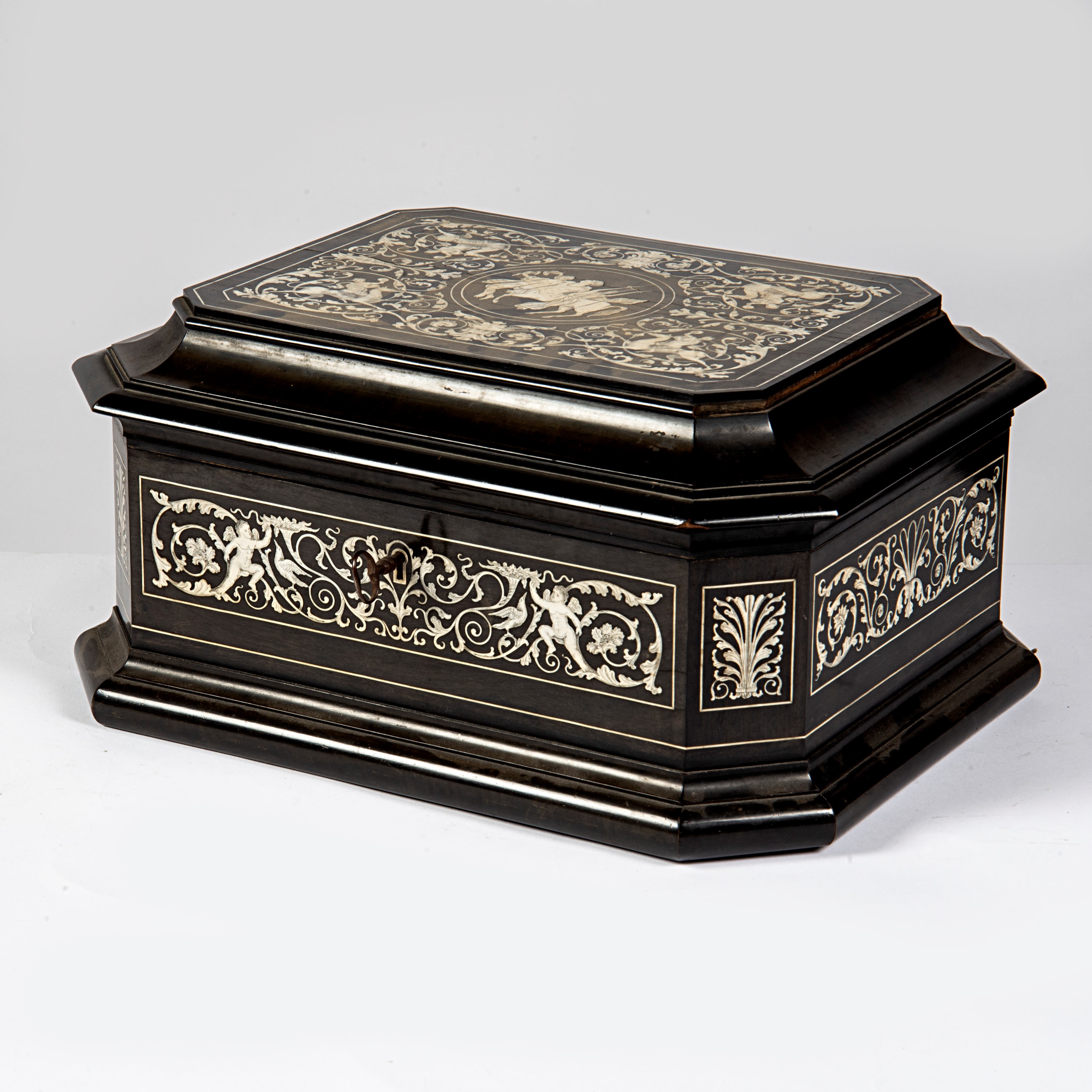 in legno ebanizzato ed intarsiato a figure e fiori, cm L36xP30xH18 difetti