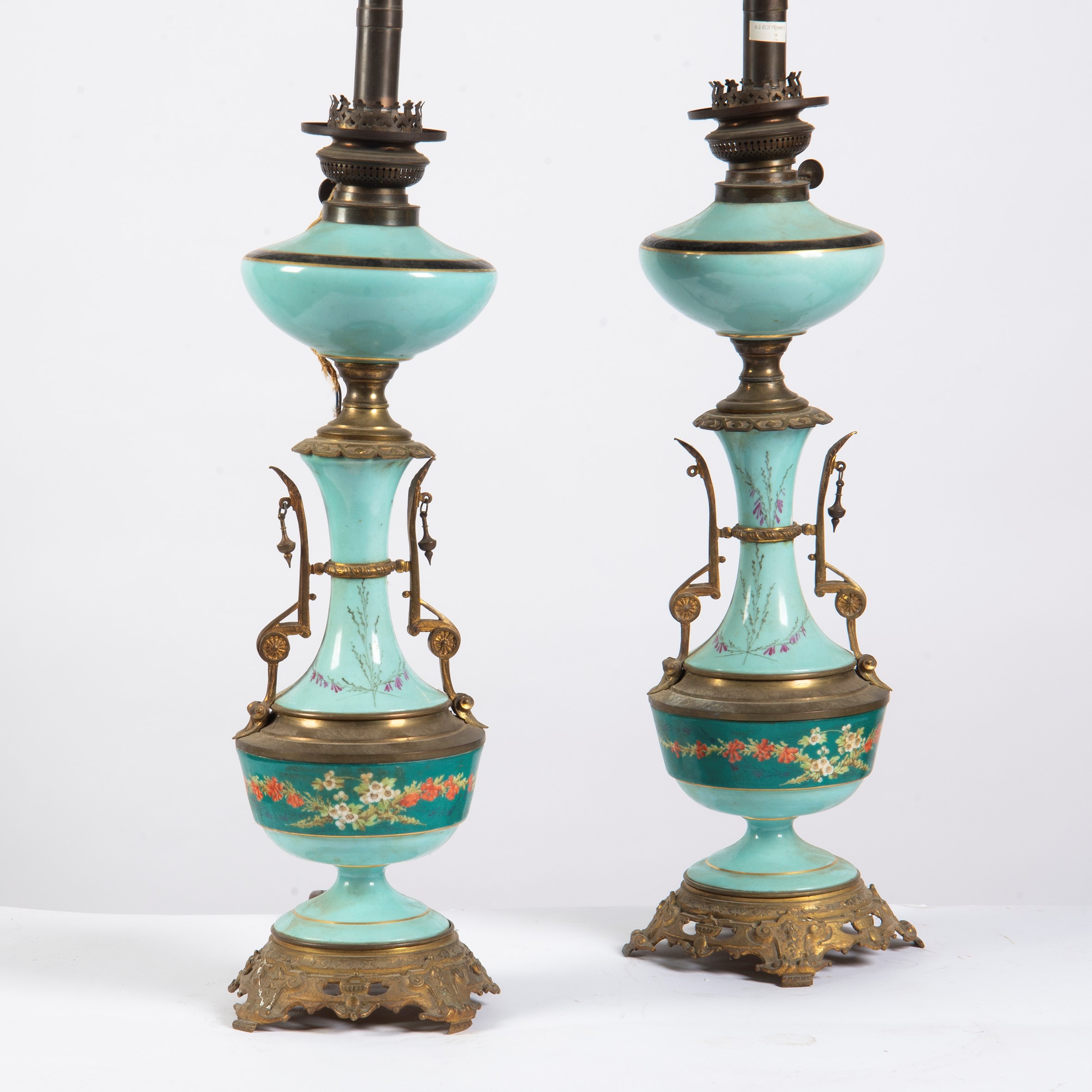in opalina azzurra con guarnizioni e anse in metallo dorato, alt. cm 81, adattate ad elettricità