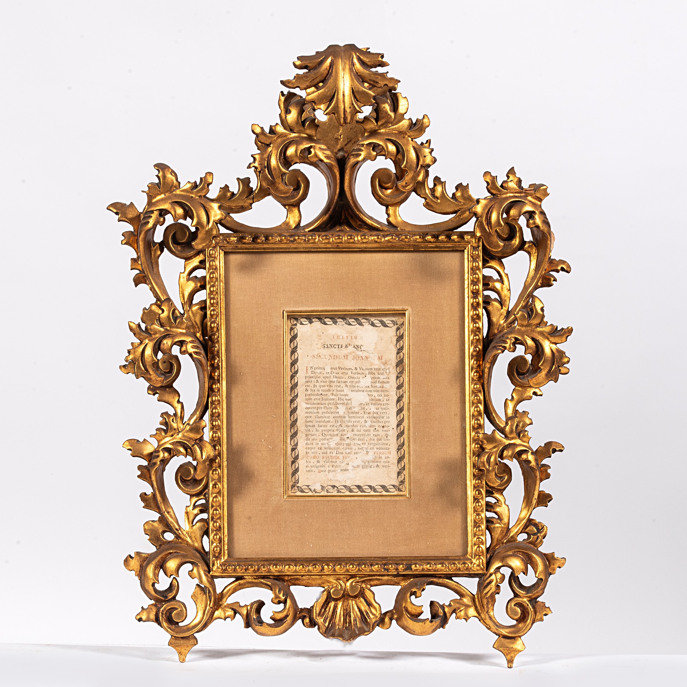 in legno intagliato e dorato, con all'interno stampa, cm 58x43, luce cm 23x29