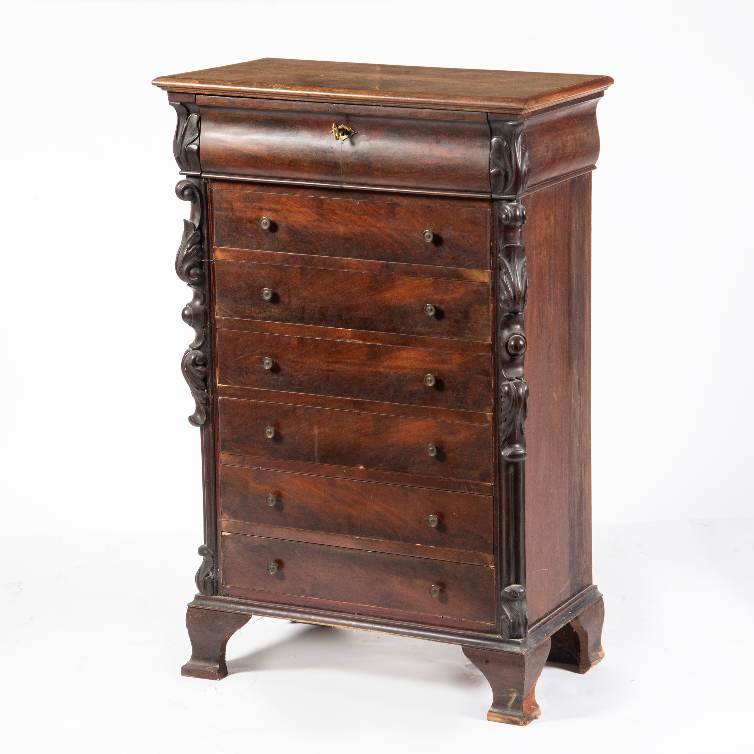 in mogano, laterale intagliato, sette cassettini, cm L66xP38xH102