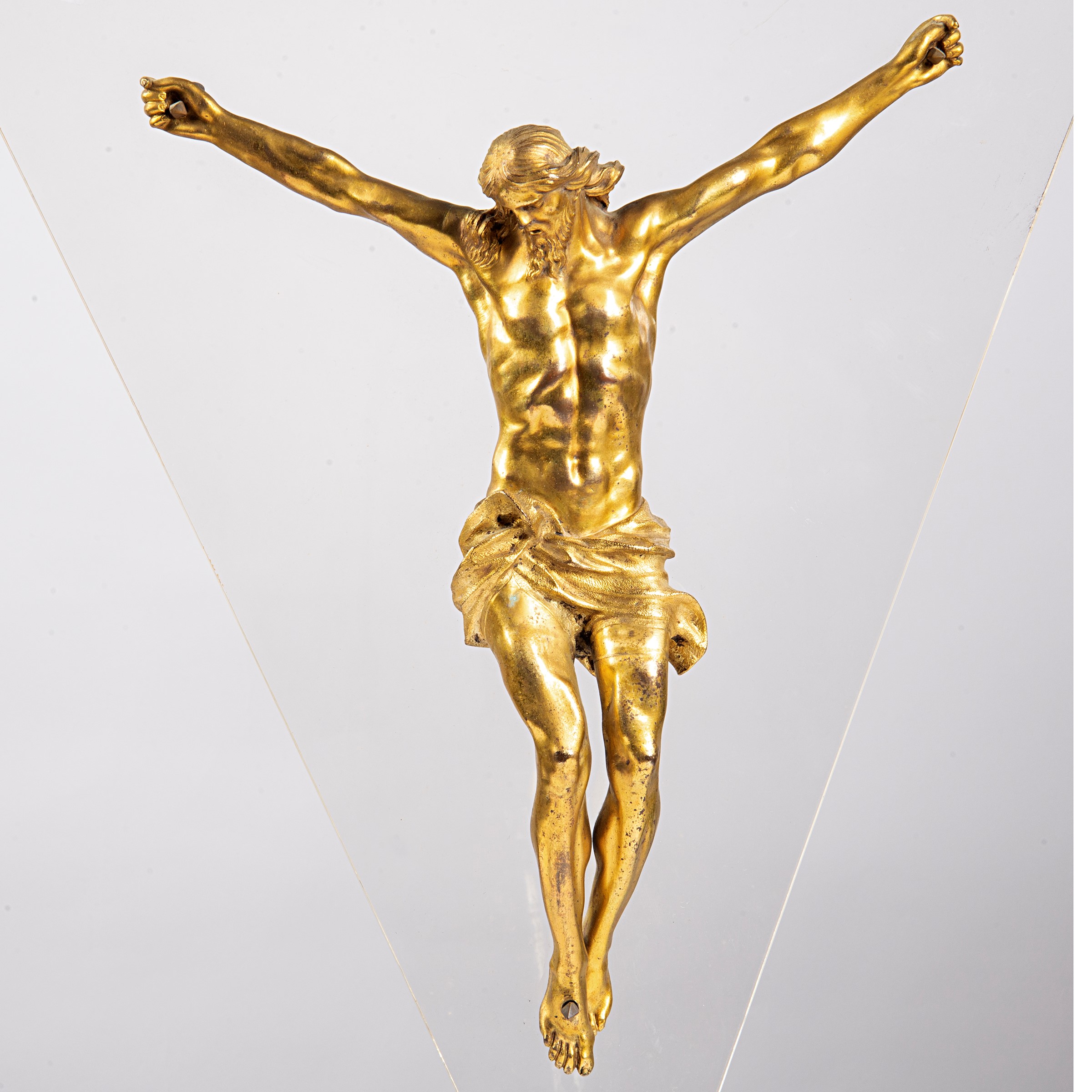 in bronzo dorato su base in plexigass, scultura cm L32xH43, con plexigass triangolare cm L50xH62