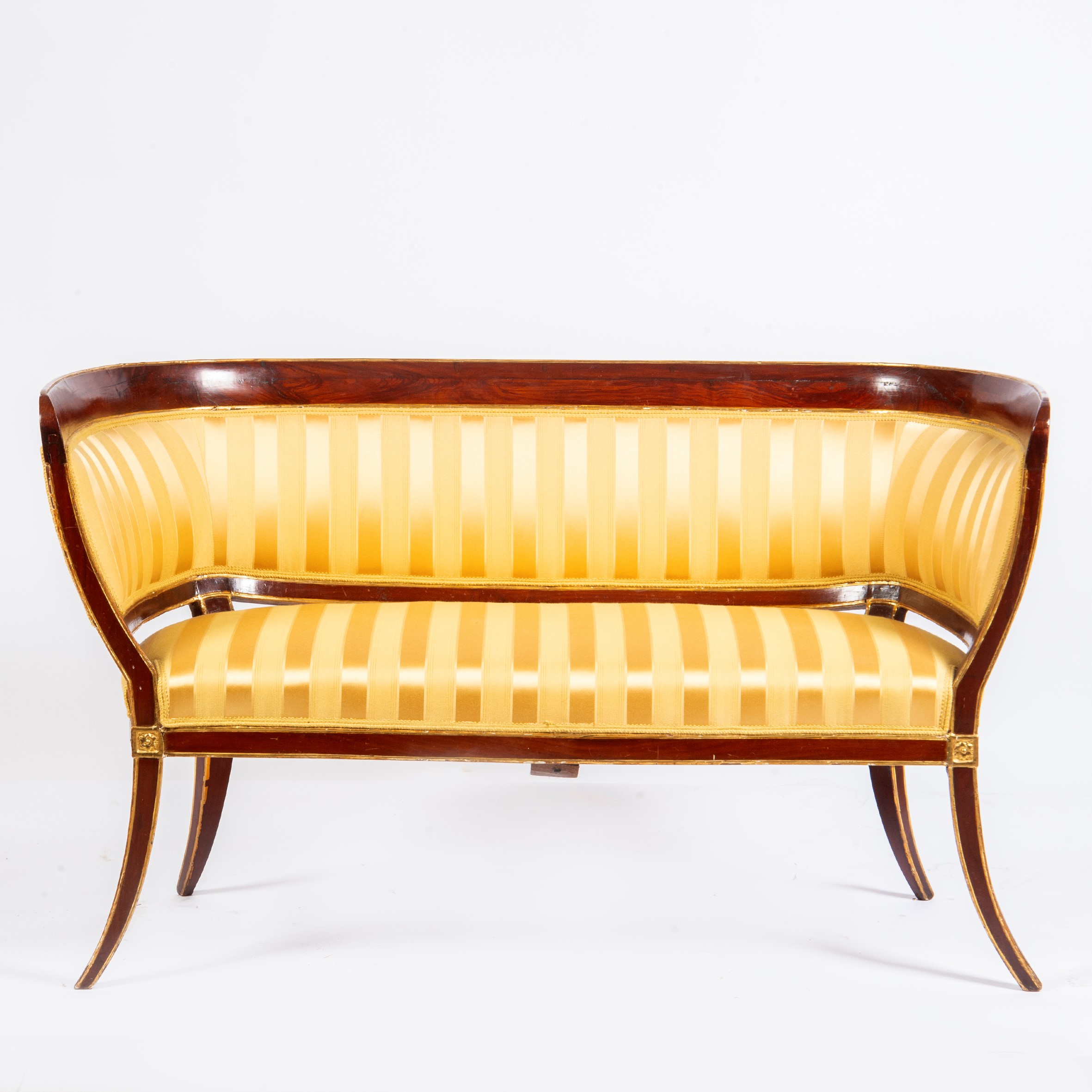 in noce con rifiniture in oro, imbottito e rivestito in stoffa a righe, cm L139xP60xH83