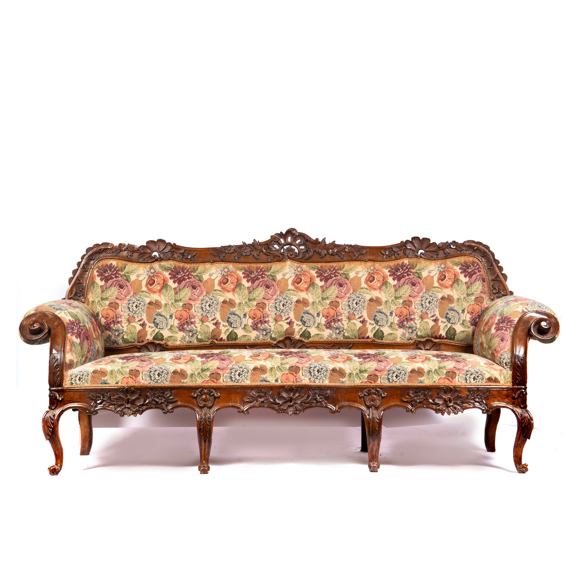 in noce intagliato, rivestito in stoffa a fiori, L243xP70xH107, difetti
