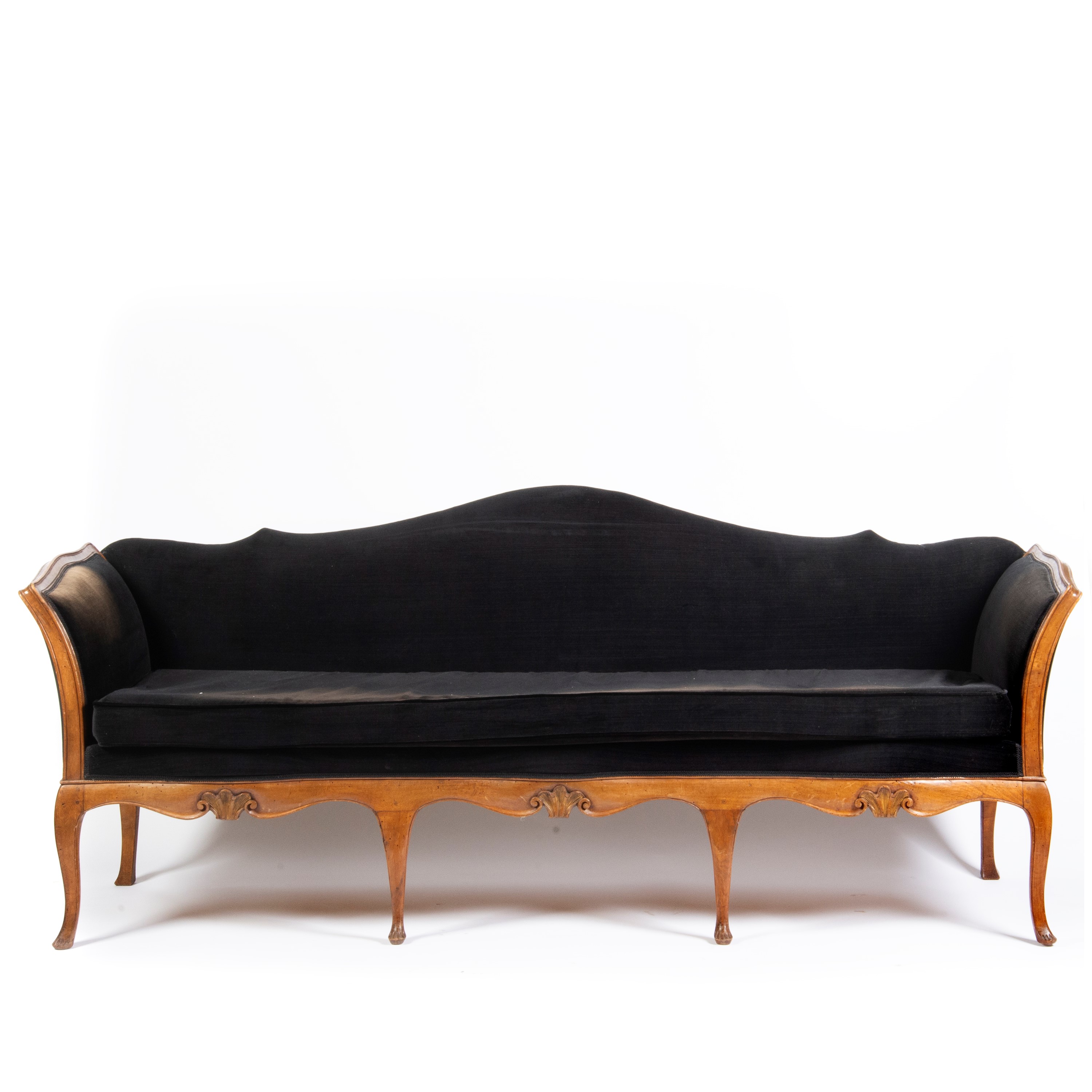 in noce intagliato, braccioli e schienali mossi, rivestito in velluto, cm L211xP70xH80