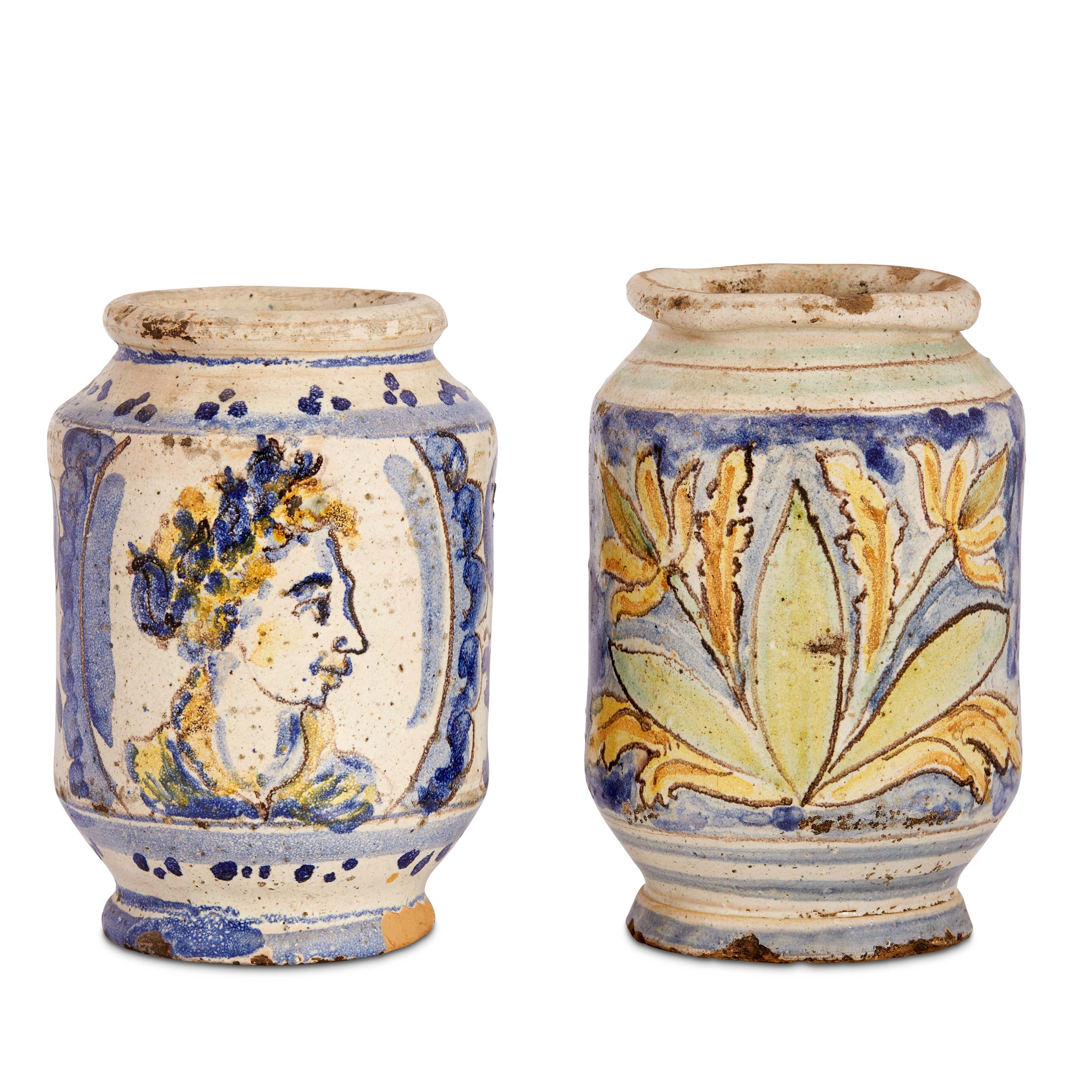 in maiolica dipinta in policromia, uno decorato con ritratto di profilo entro medaglione, l'altro con motivi di ispirazione vegetale, alt. cm 15 e cm 15,5