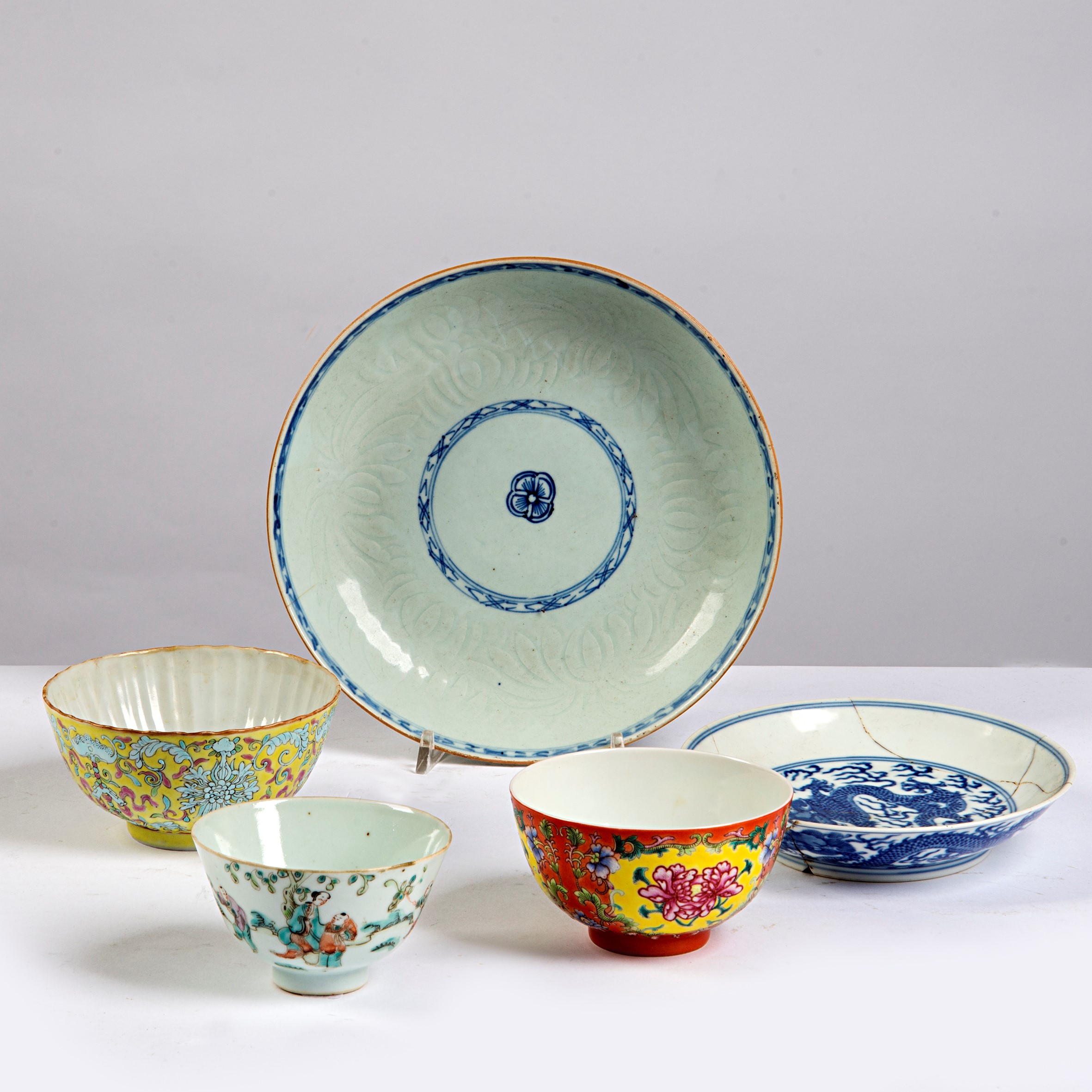 Due piatti, tre tazze, arte orientale, sec. XIX e XX