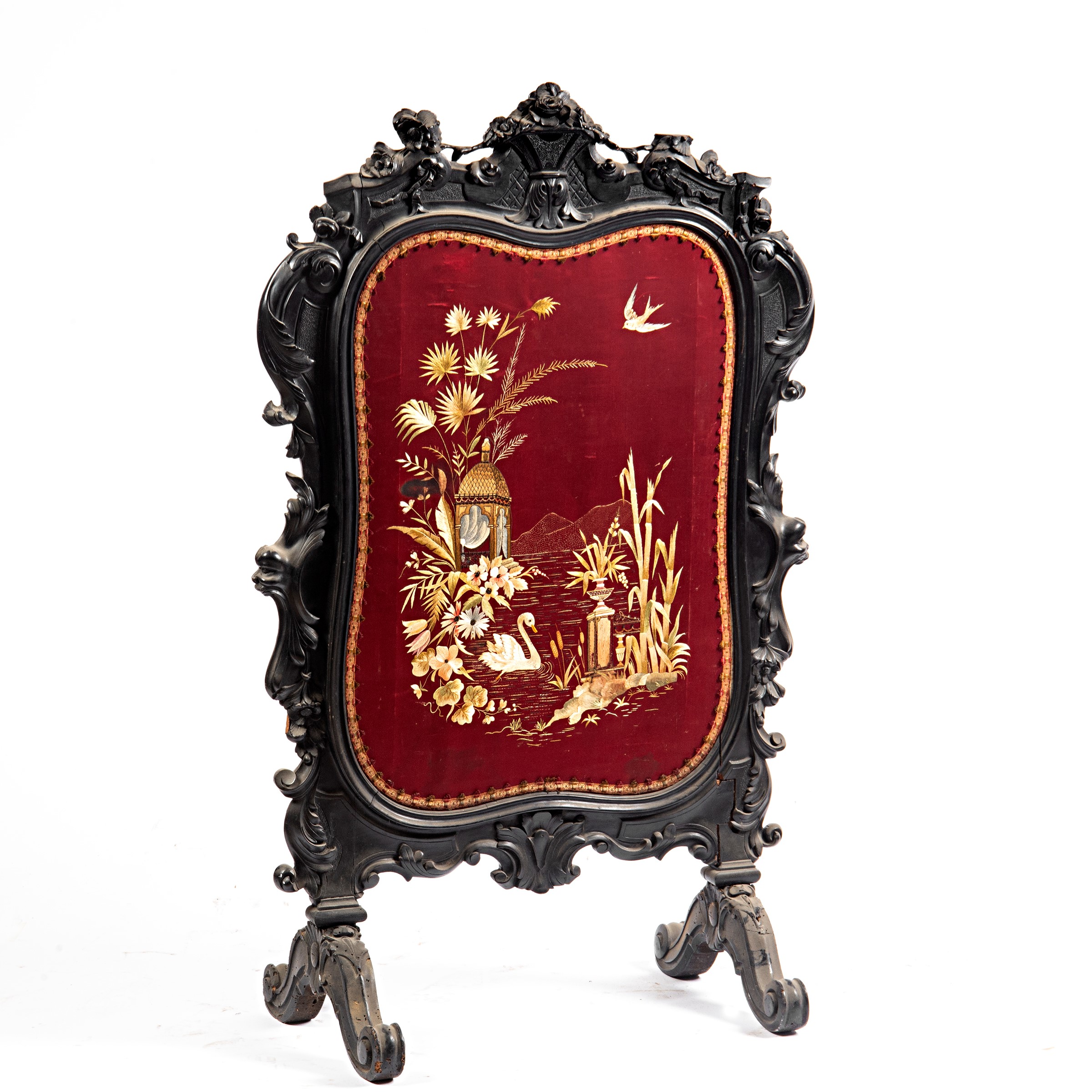 in legno laccato ed intagliato, con al centro stoffa decorata, cm L78xH123, difetti