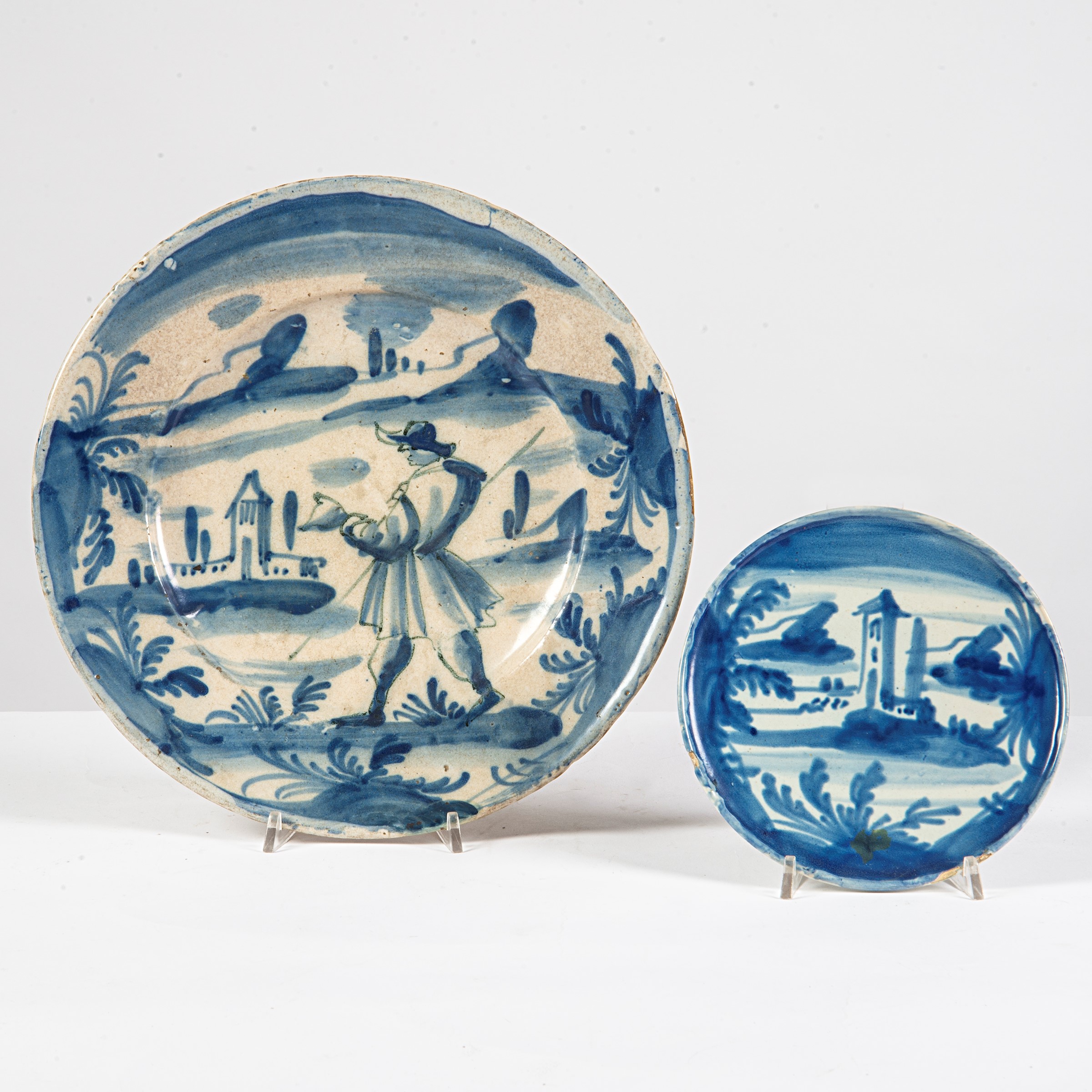 in maiolica circolare con decori a paesaggi, diam. cm 30 e 18