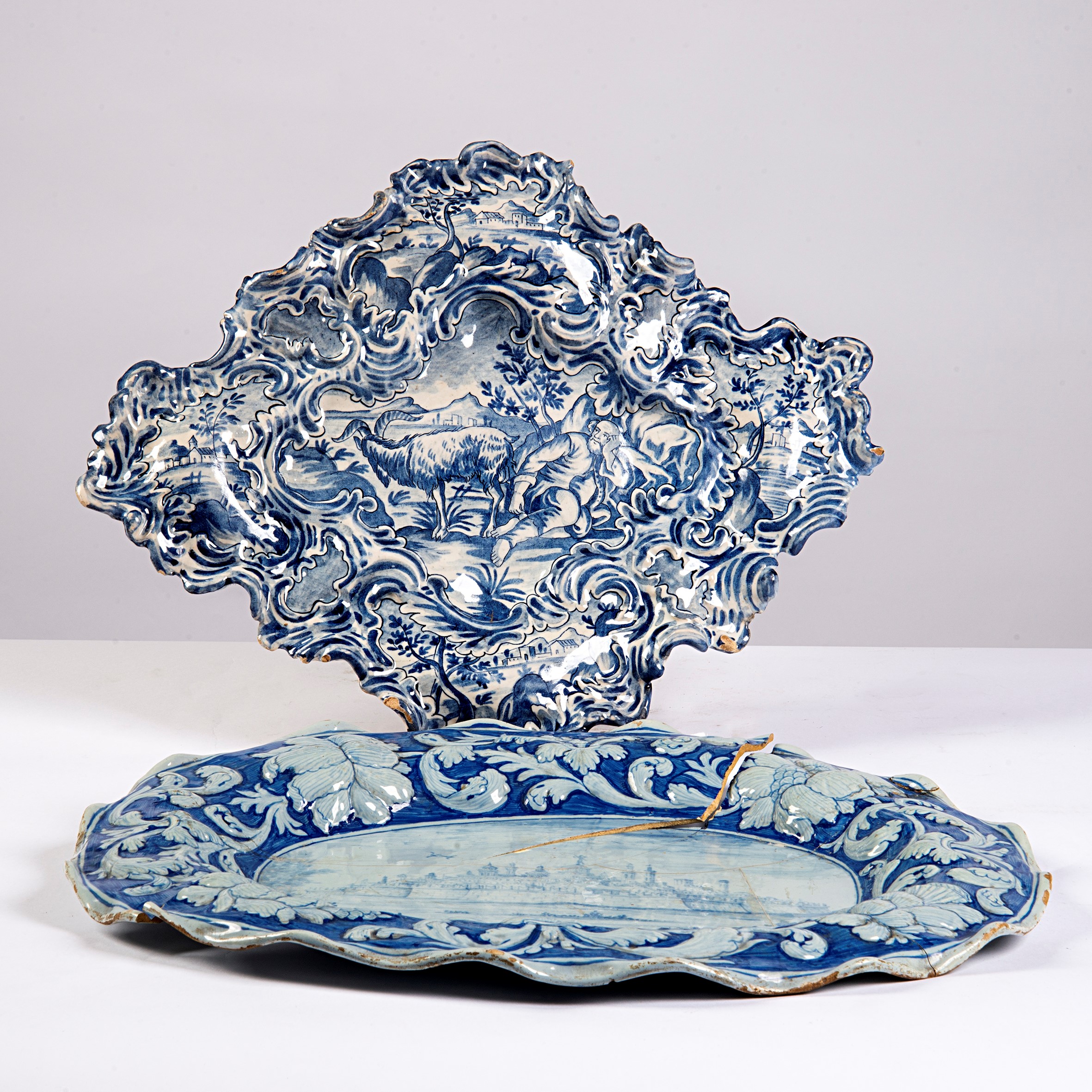in maiolica con decori a paesaggio e pastore, cm 38x45, sbeccature e mancanze