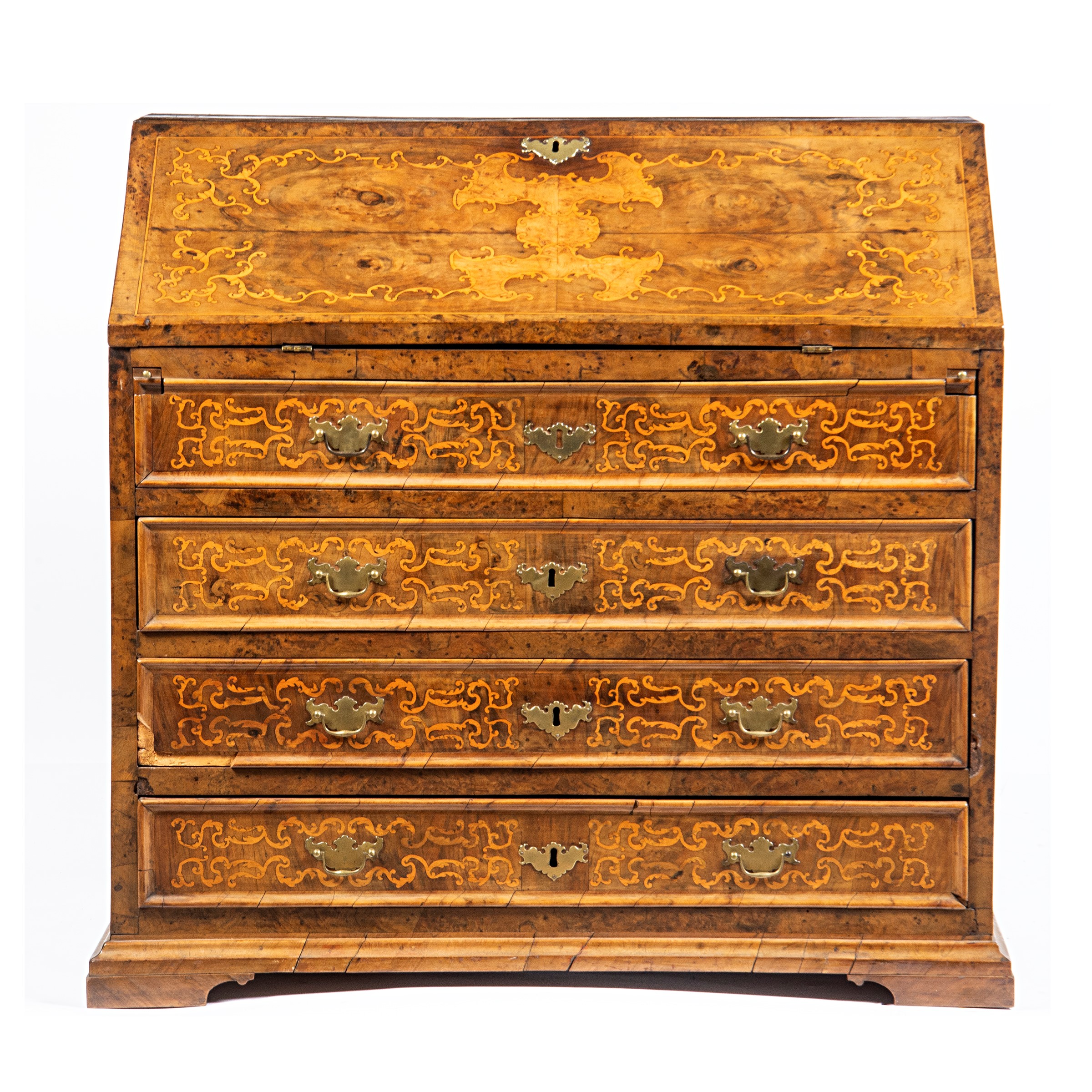 in radica di noce intarsiato, tre cassetti, sportello con internamente cassettini e vani, cm L105xP56xH104