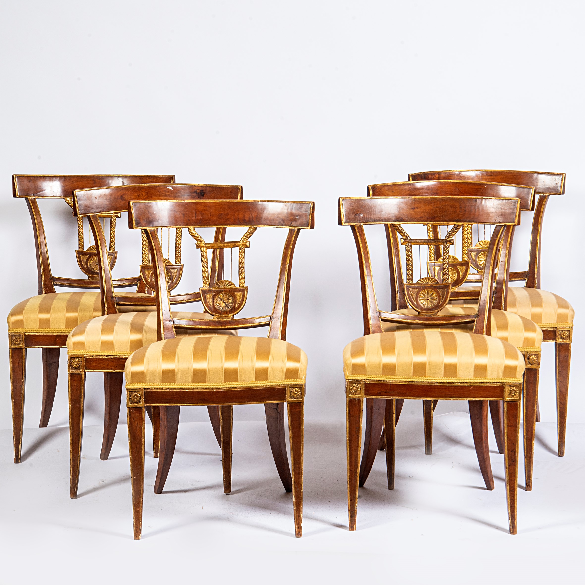 in noce, con spalliere a lira dorate, seduta imbottita e rivestita in stoffa a righe, alt. cm 83