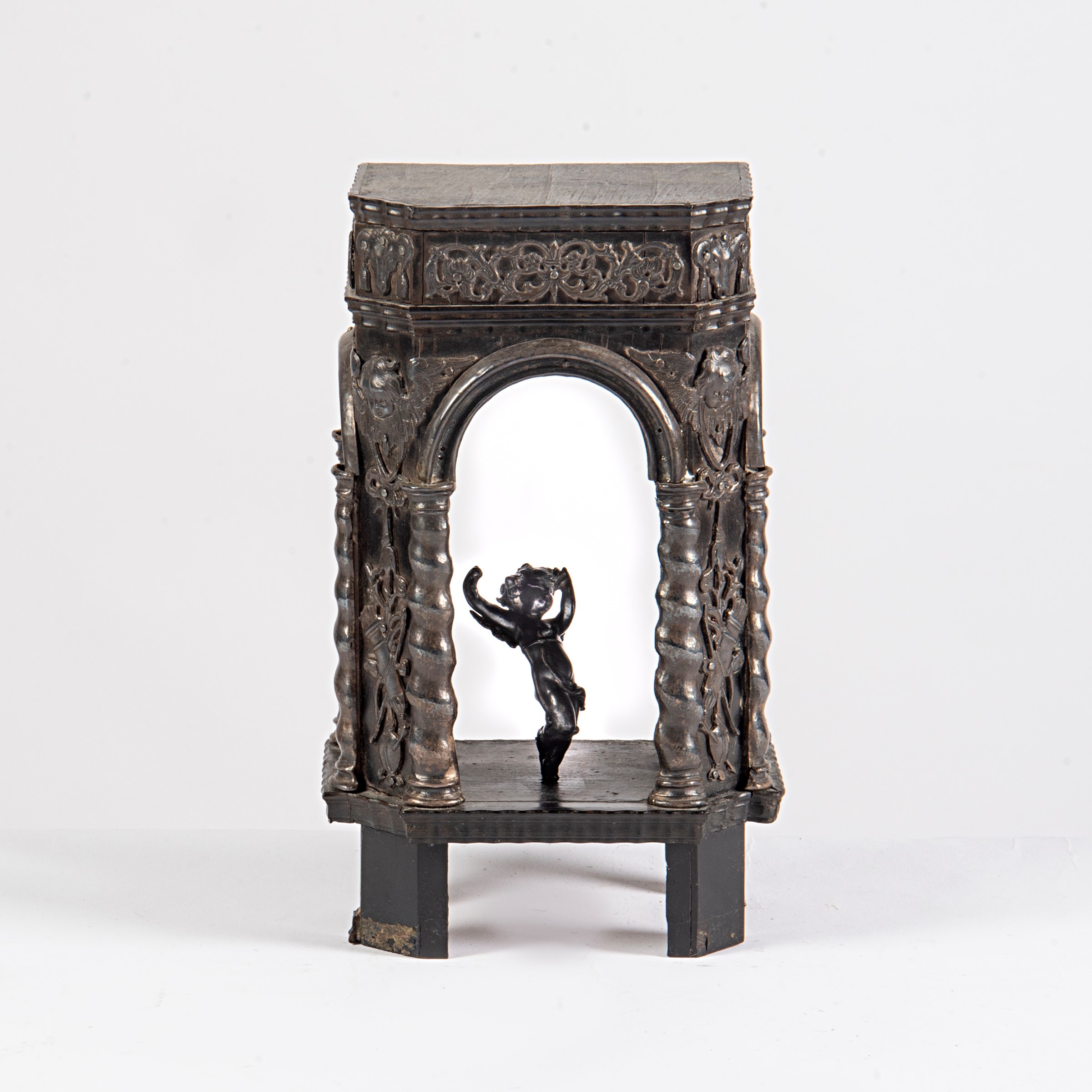in legno intagliato, con all'interno putto in metallo argentato, cm L16xP10xH26, difetti