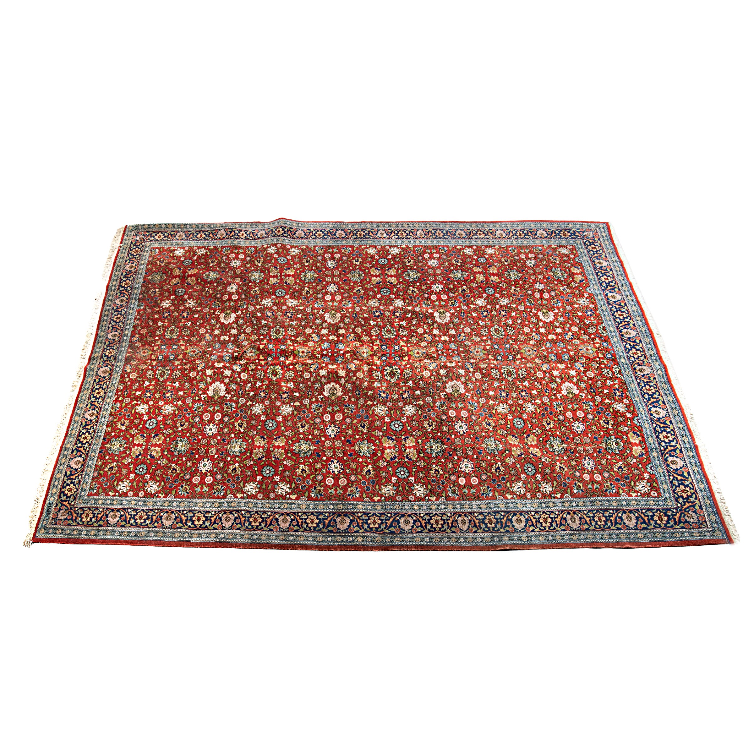 campo a motivo floreale nei toni del rosso, blu, beige e verde, bordura blu e celeste, cm 322x237, firmato