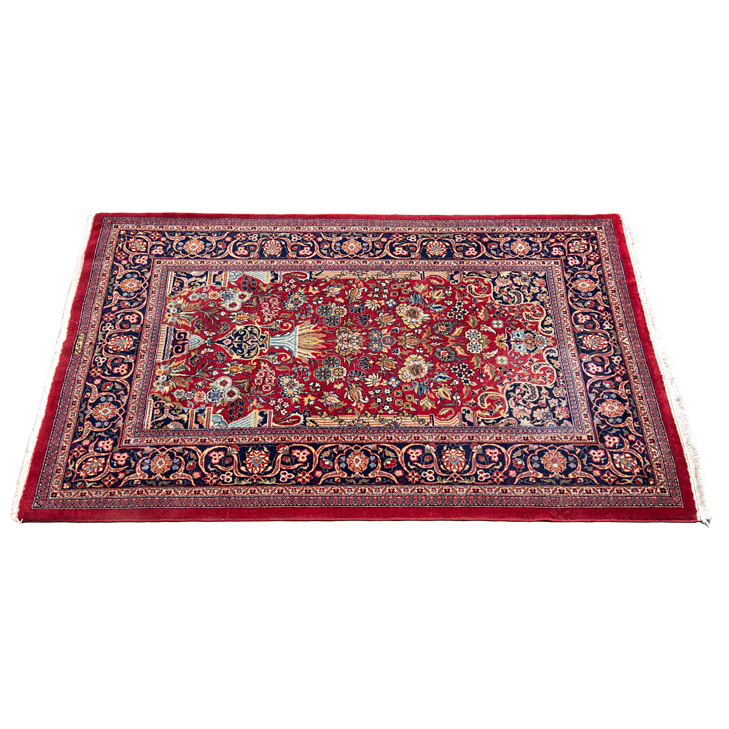 fondo rosso campo a motivo floreale nei toni del blu, beige, verde e celeste, cm 205x140, firmato