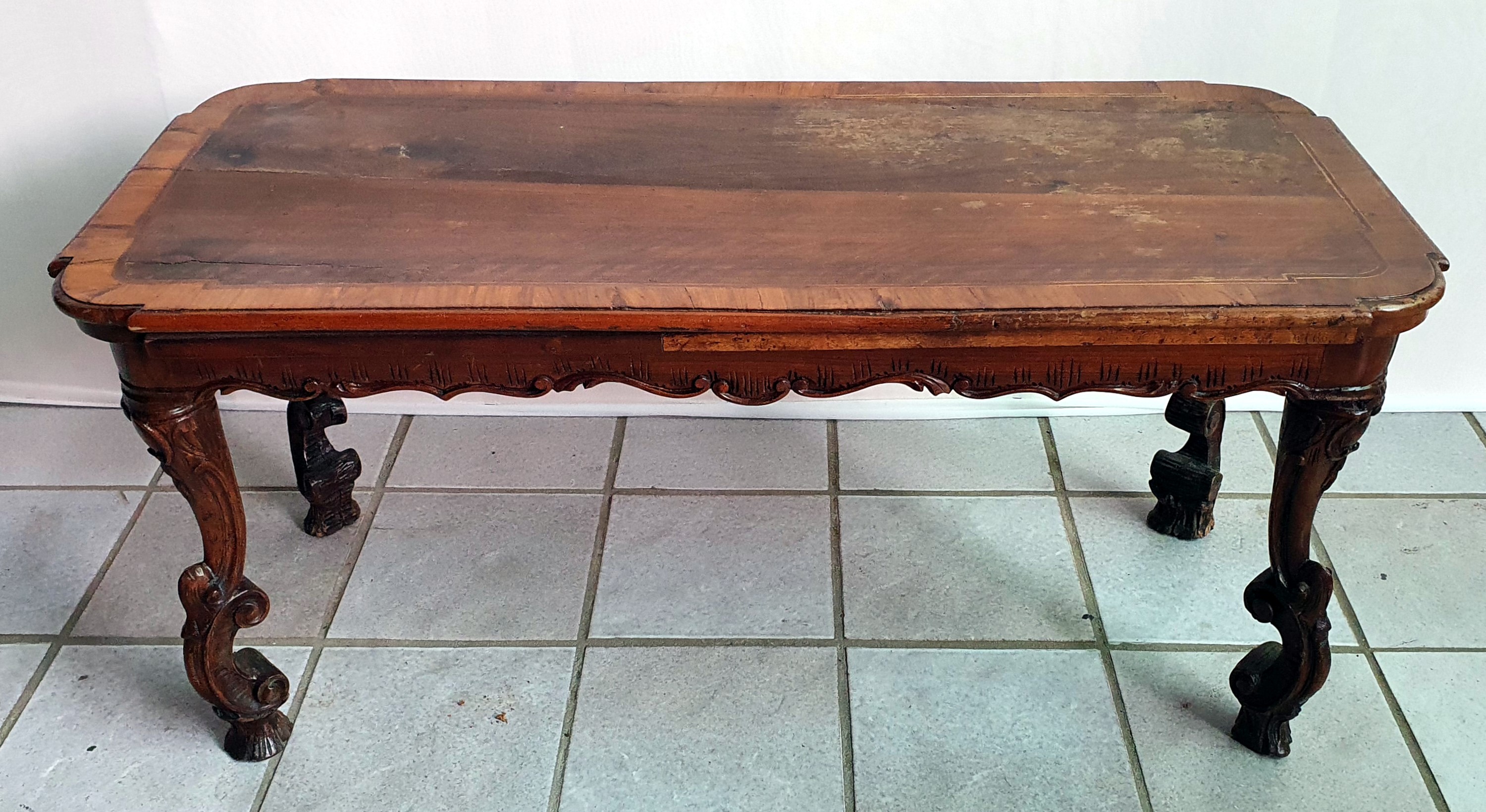 in noce filettato, gambe intagliate, cm 103x47x48, ricostruito con materiale antico, difetti
