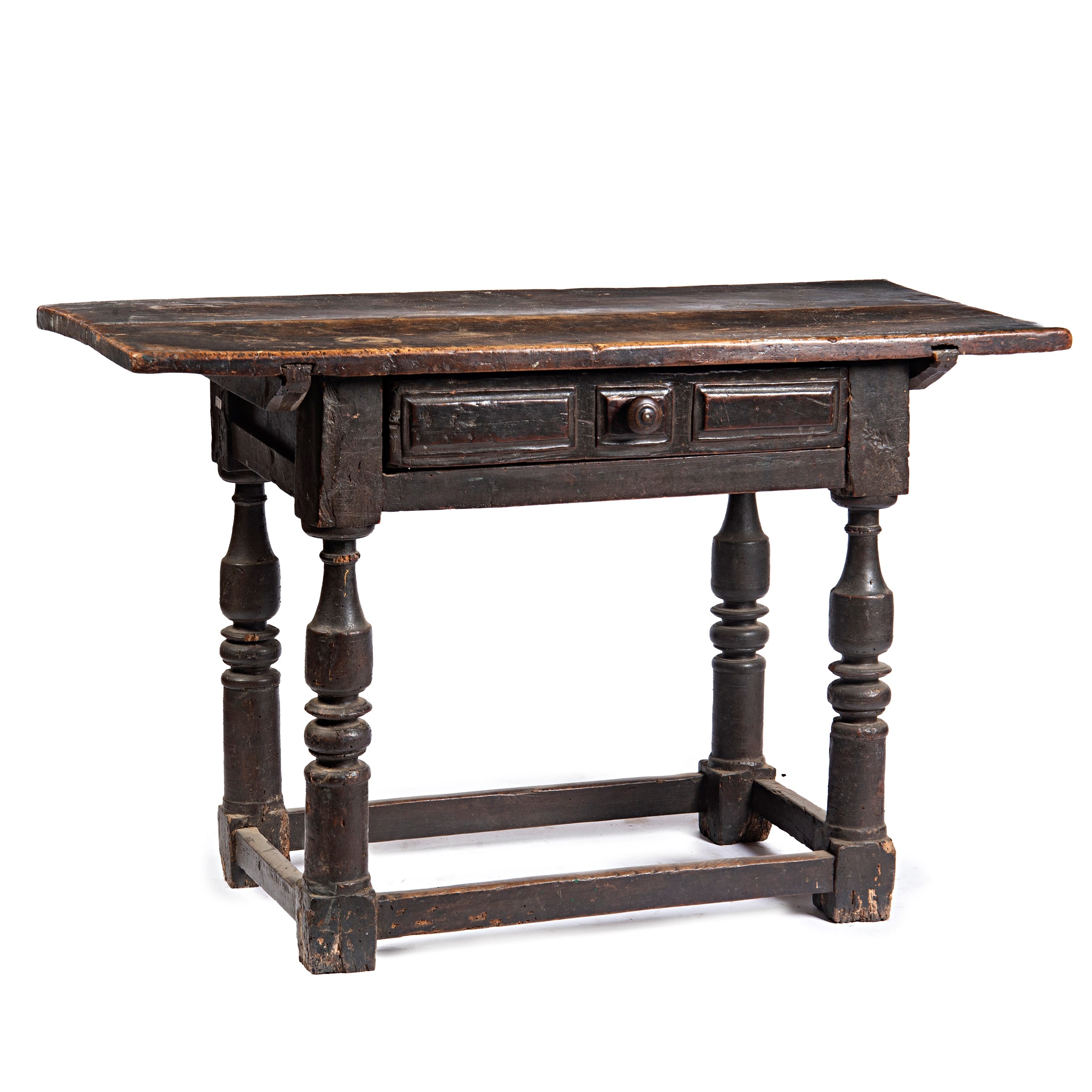 in noce, fascia con un cassetto, gambe tornite riunite da traverse, cm L120XP56xH77