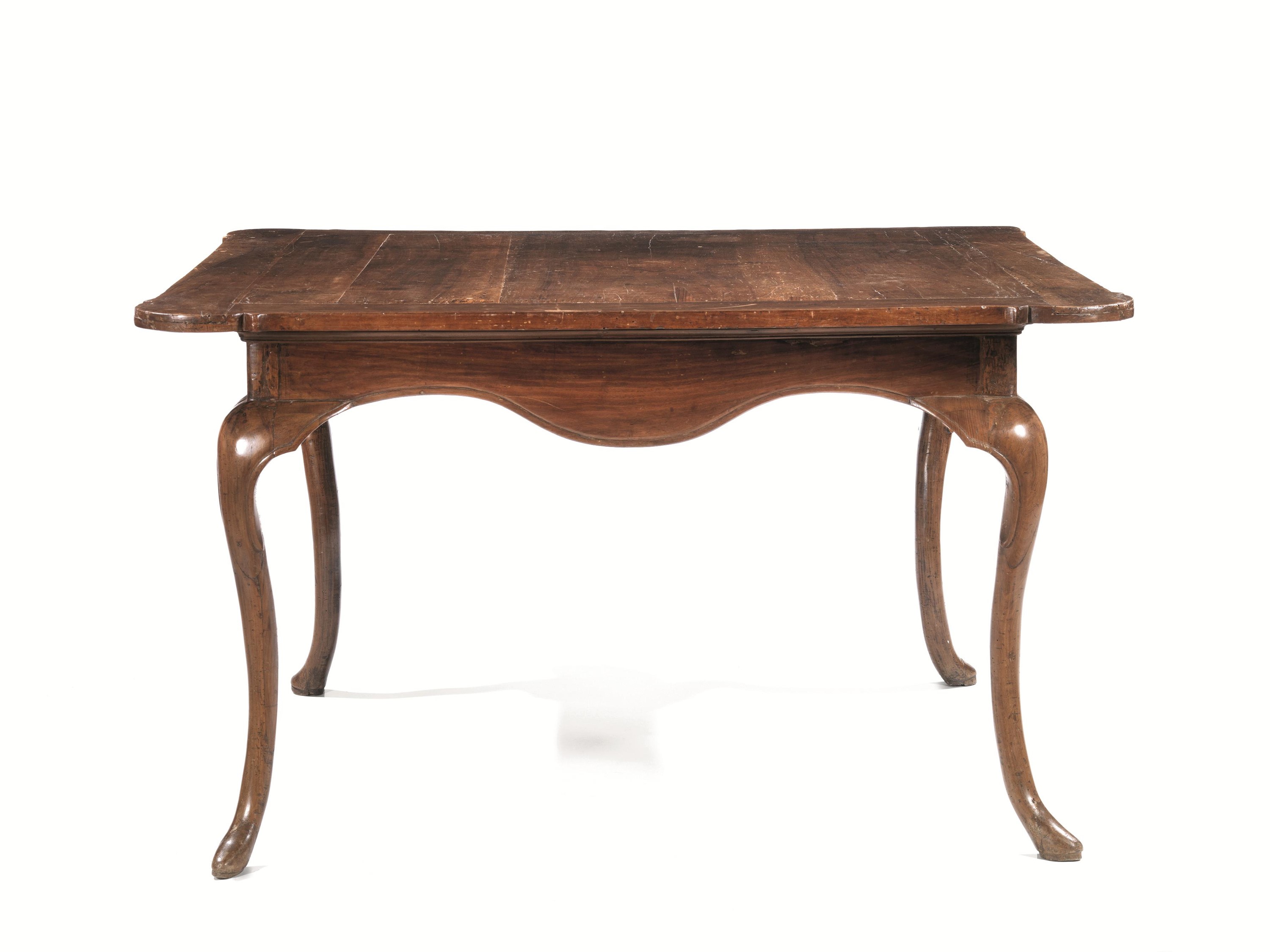 in noce, piano quadrato con angoli sagomati, fascia ondulata, gambe mosse su piedi a zoccolo stilizzato, cm L134xP134xH78, alcuni restauri