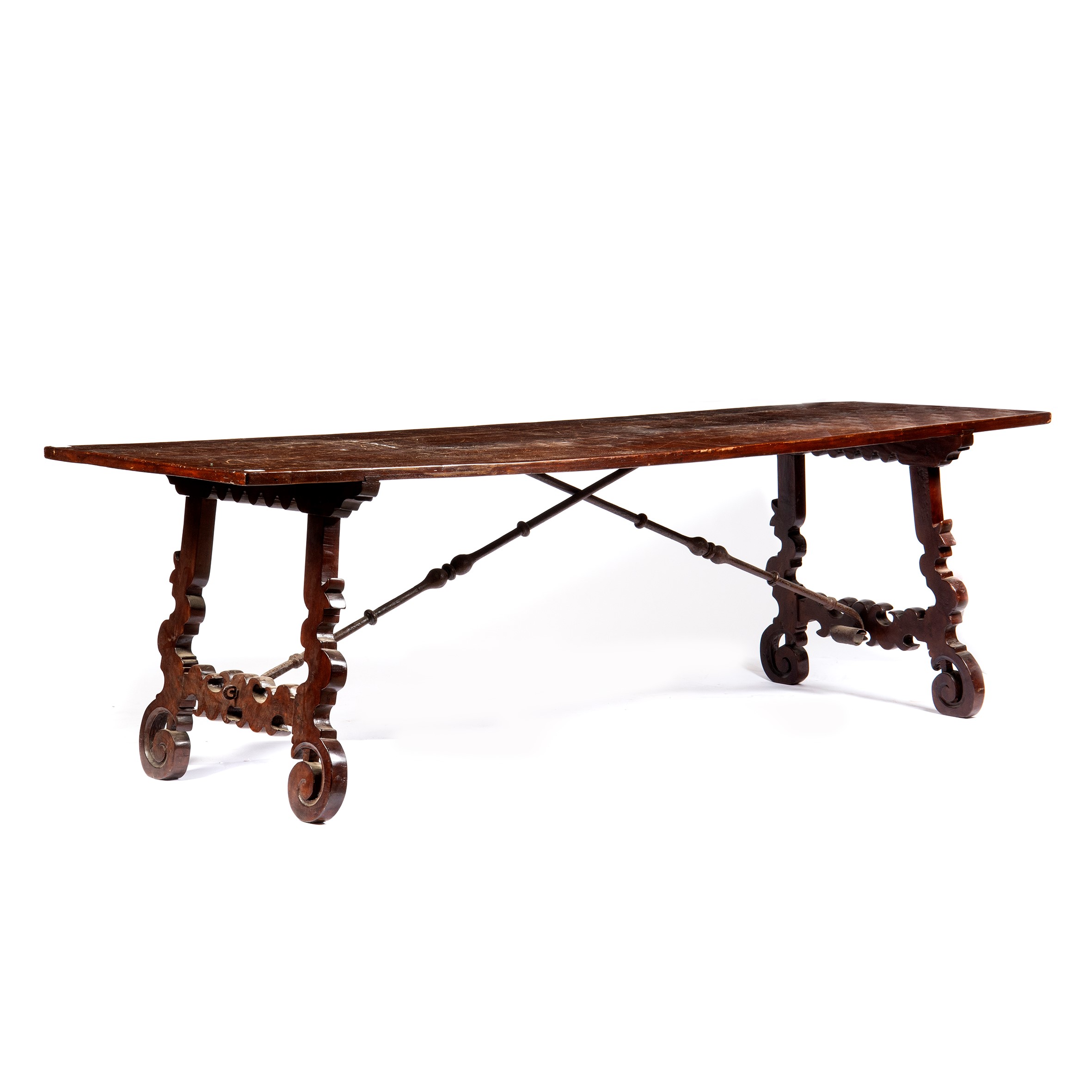 in noce, piano rettangolare, gambe a lira riunite da traversa in ferro tornita, cm L248xP78xH82