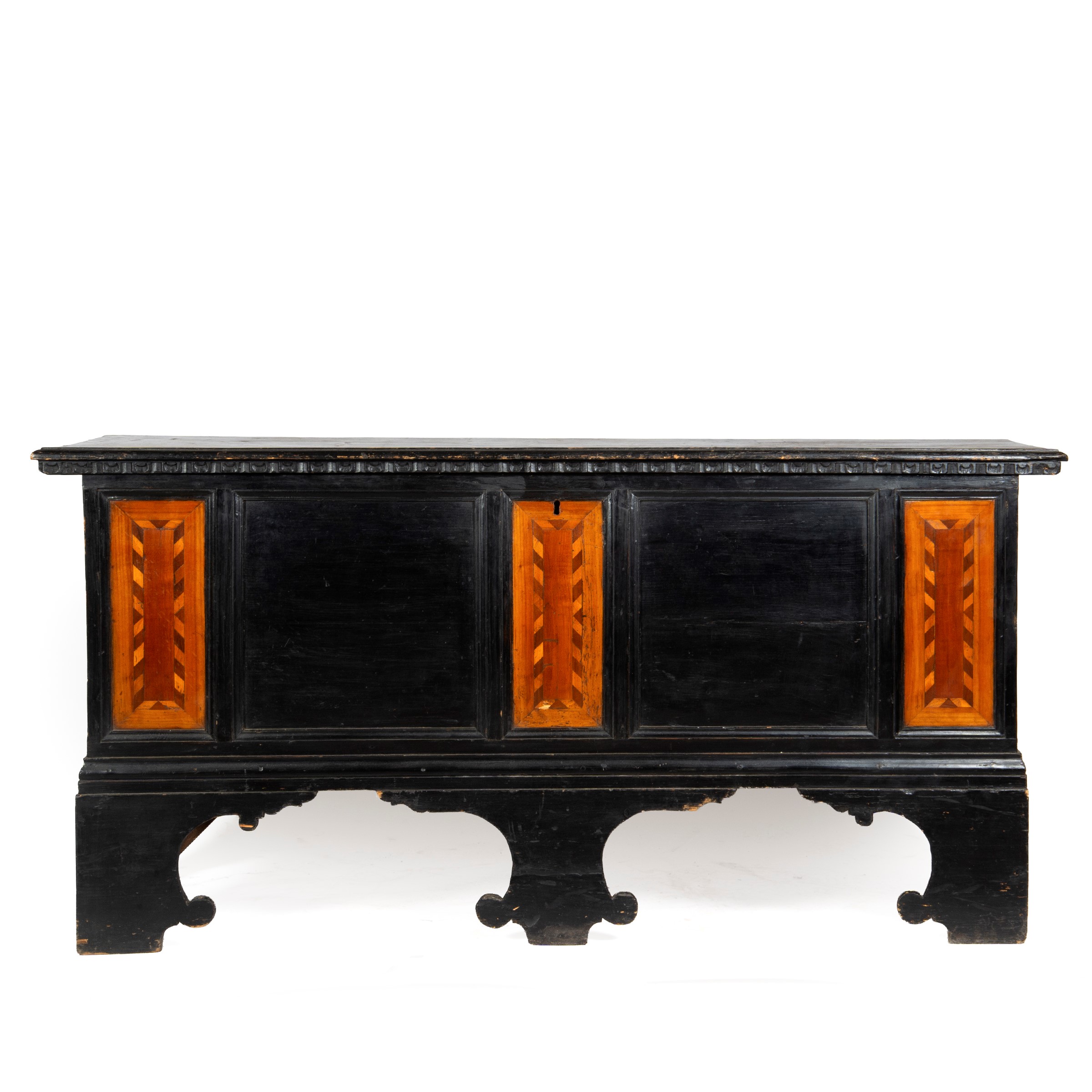 in legno laccato nero con formelle frontali intarsiate, piedi a mensola, cm L178xP60xH88