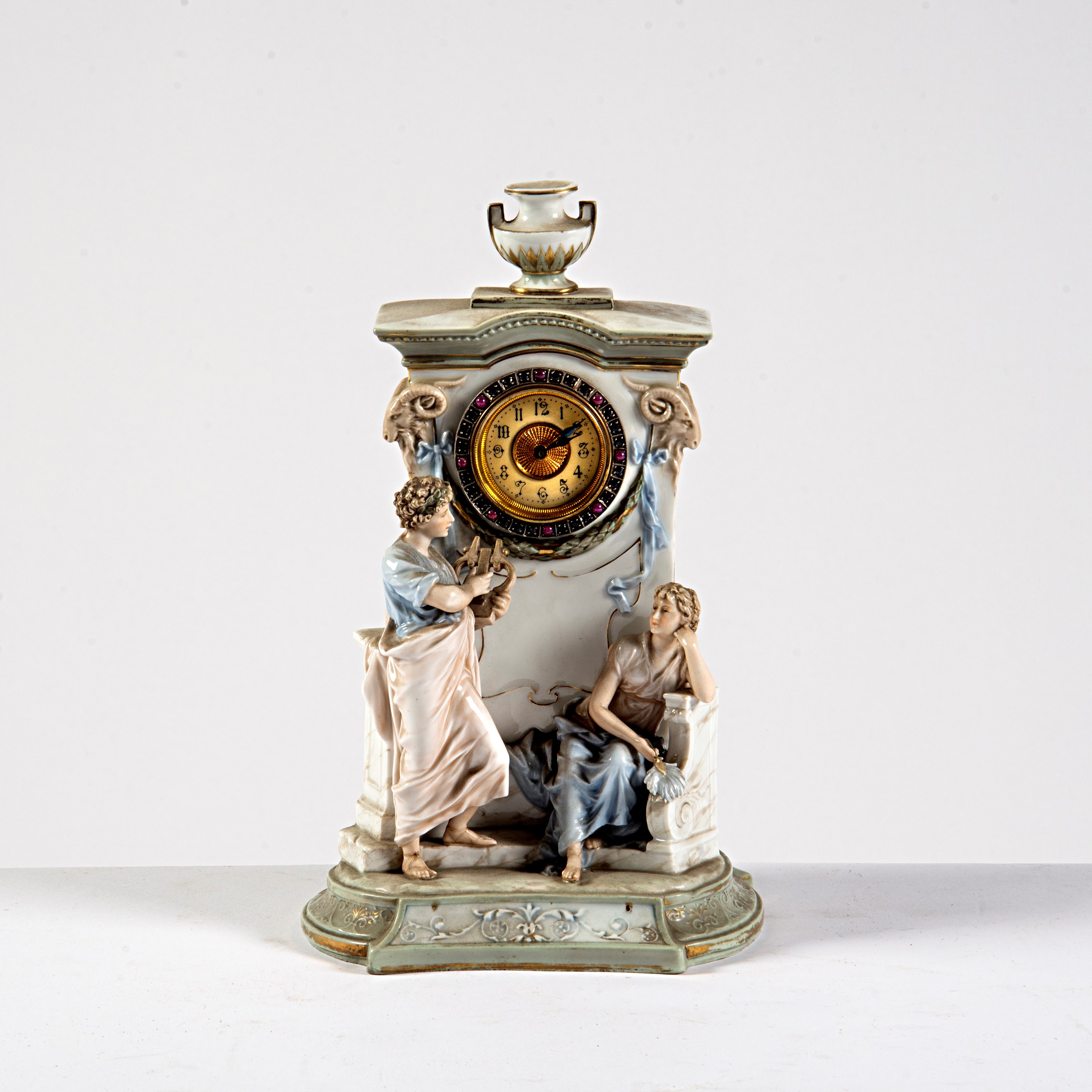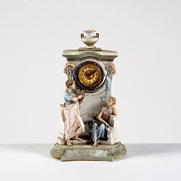 in porcellana con figure e mostra circolare in metallo, alt. cm 30