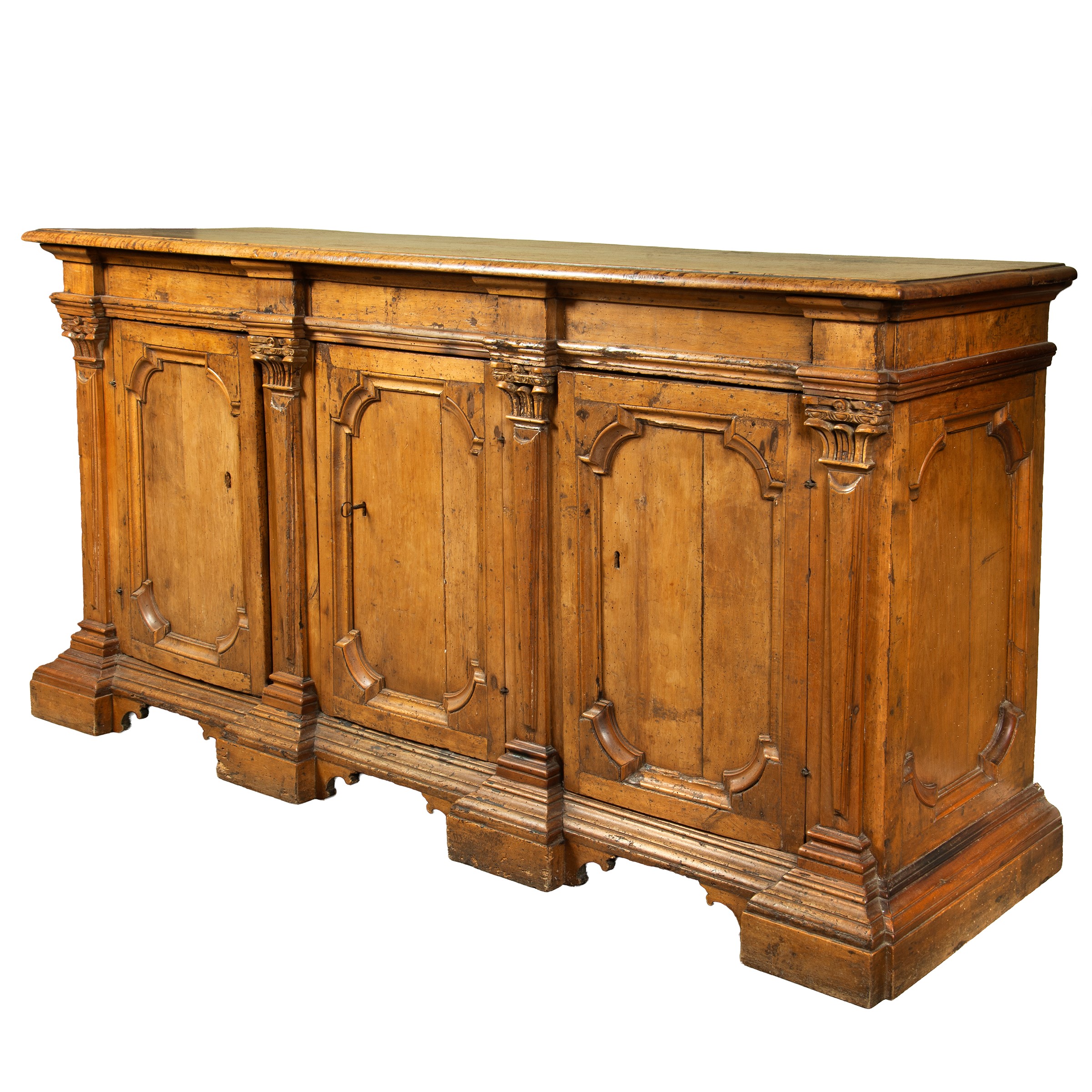 in noce a tre sportelli sformellati con fianchi a colonne, cm L208xP53xH102
