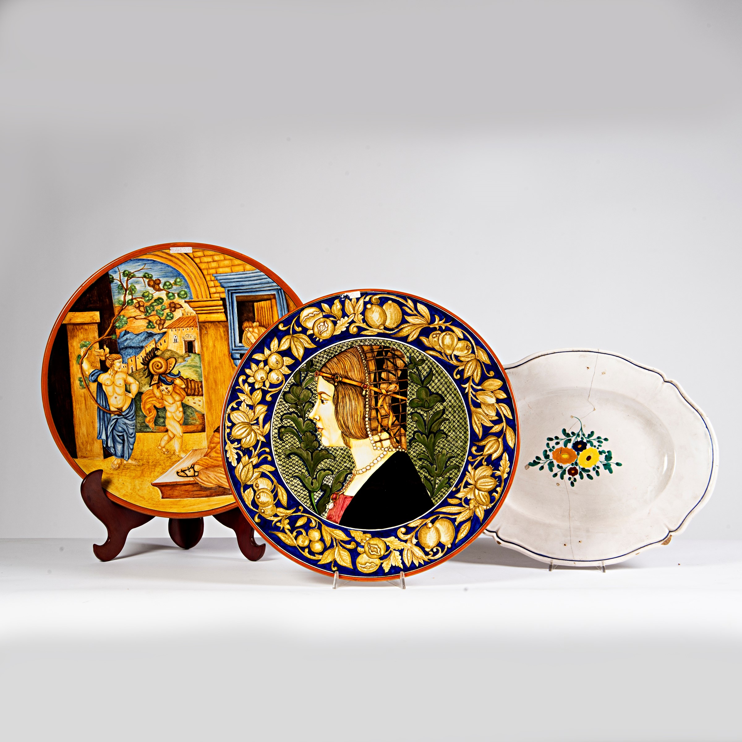 in terracotta smaltata e decorata a figure, diam. cm 45 e cm 46