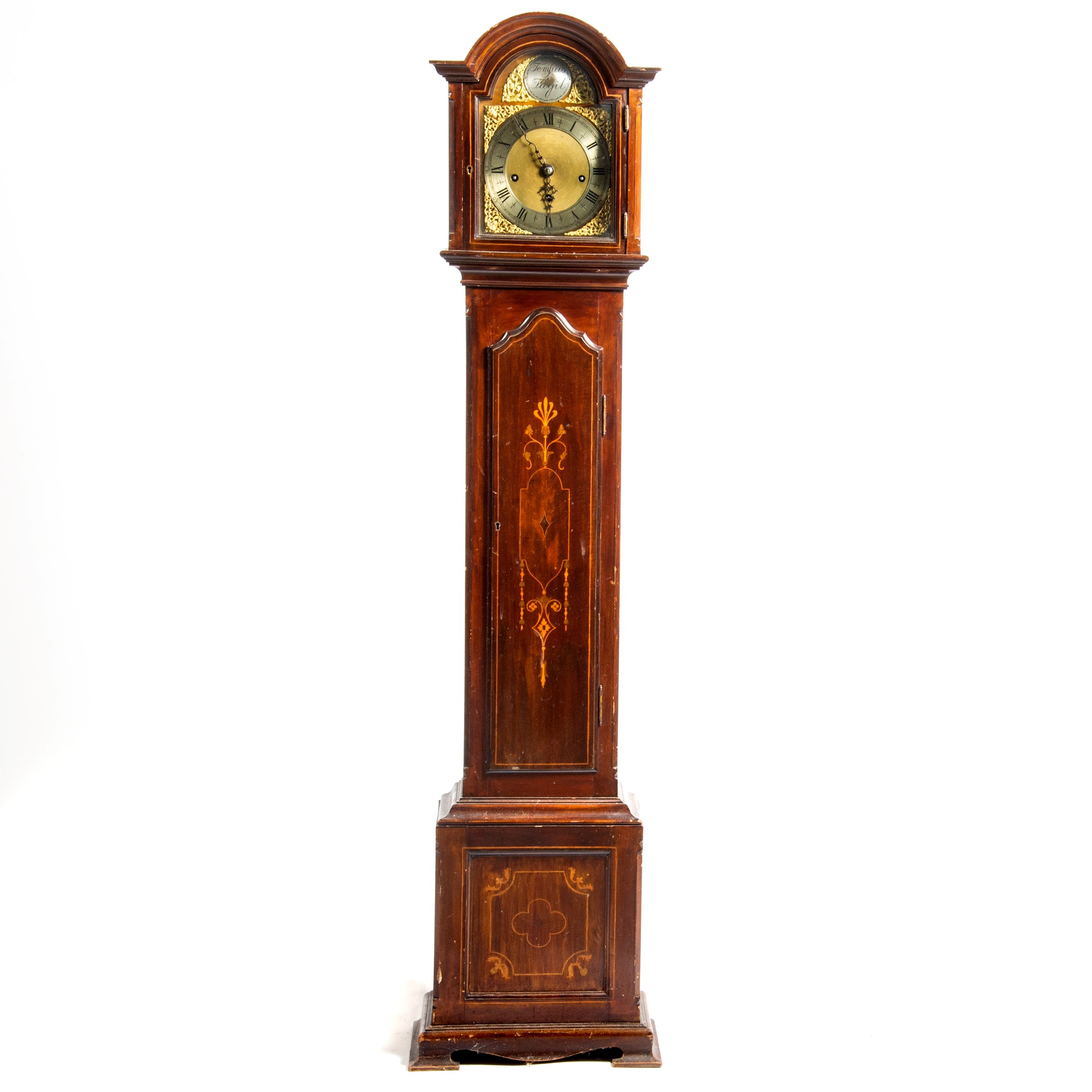cassa in mogano ad uno sportello con intarsi, mostra in metallo con fregi dorati, cm L40xP24xH165