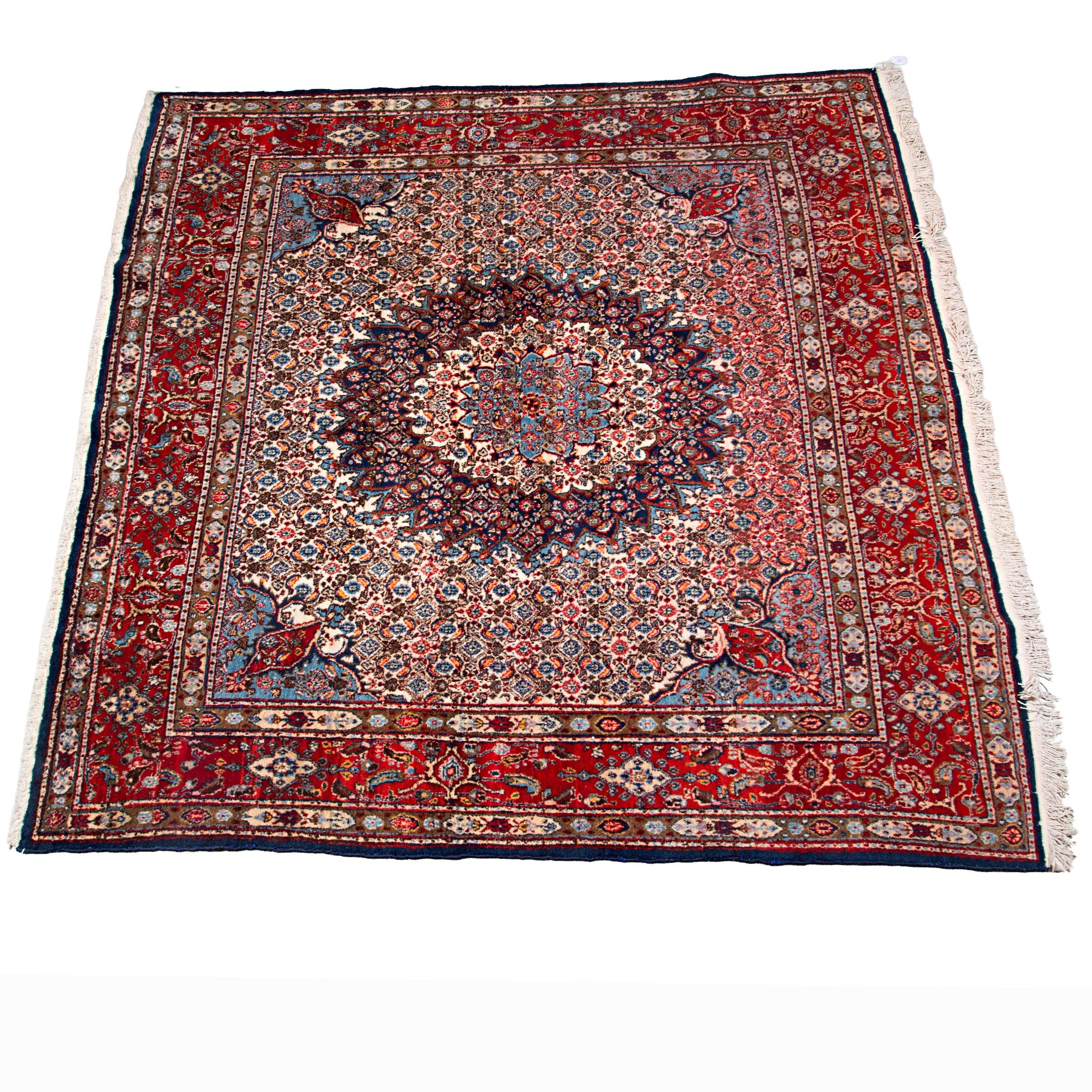 fondo beige, campo a motivo floreale stilizzato nei toni del rosso, dell'azzurro, del blu e dell'arancio, cm 205x203