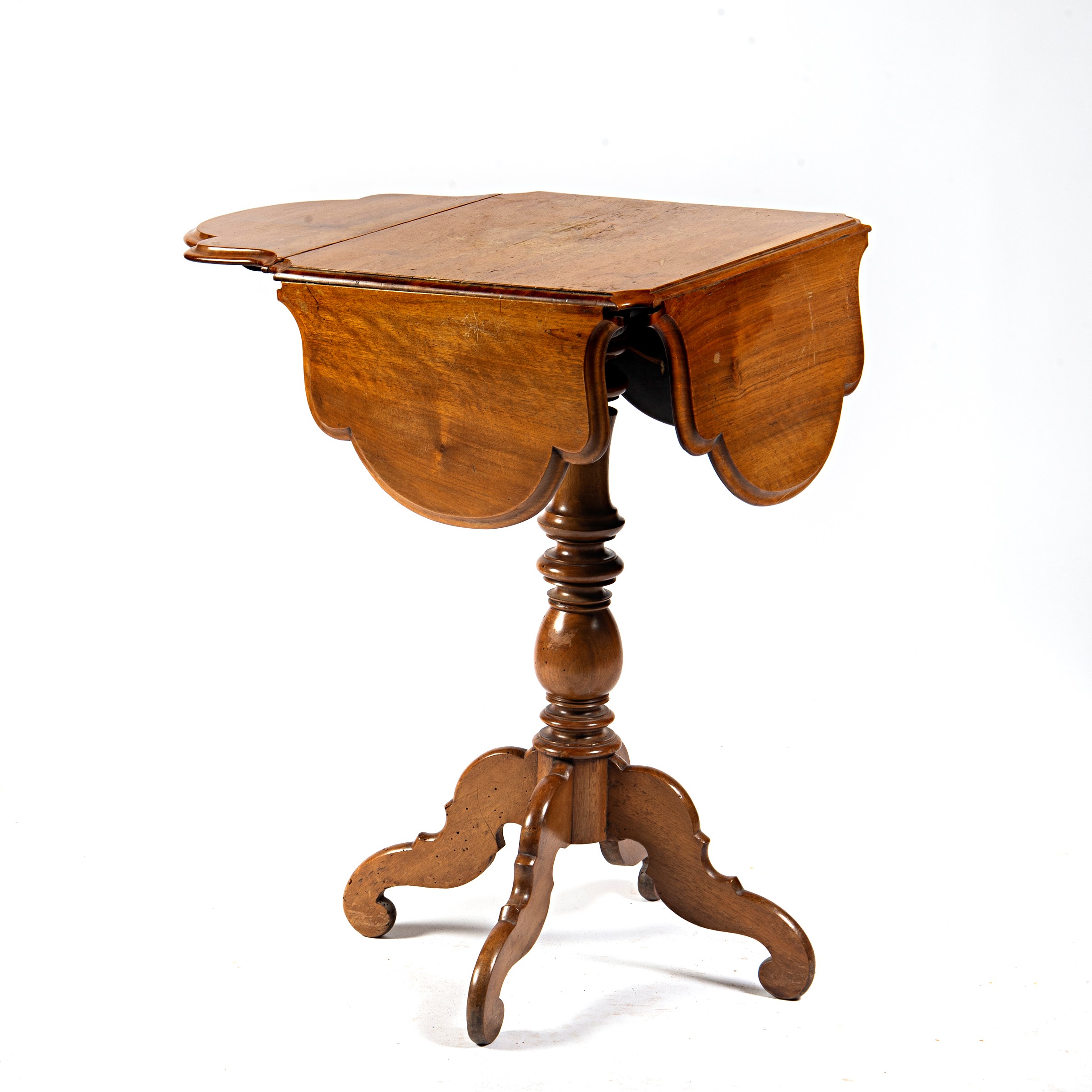 in noce, con piano a quattro alette sagomate, fusto tornito su quattro piedi mossi, cm L45xP45xH78