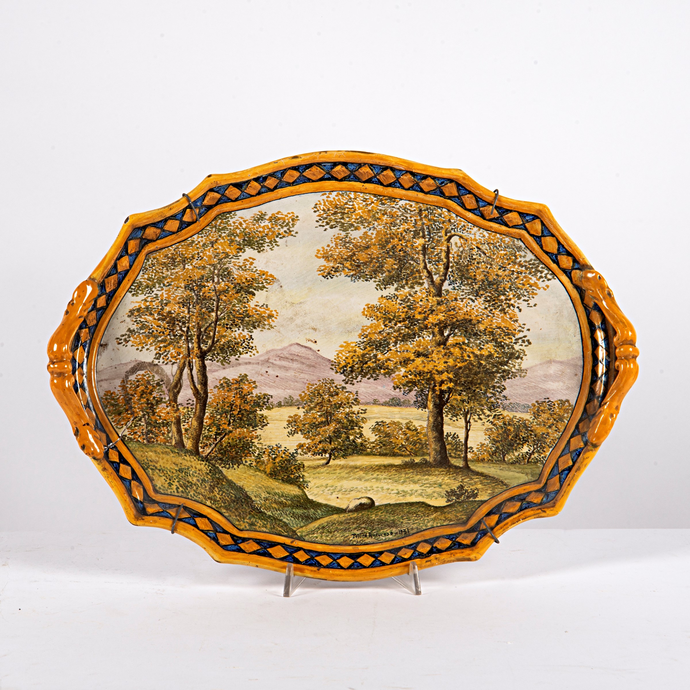 in maiolica con decoro a paesaggio, firmato Amoroso, 1931, cm L49xP36