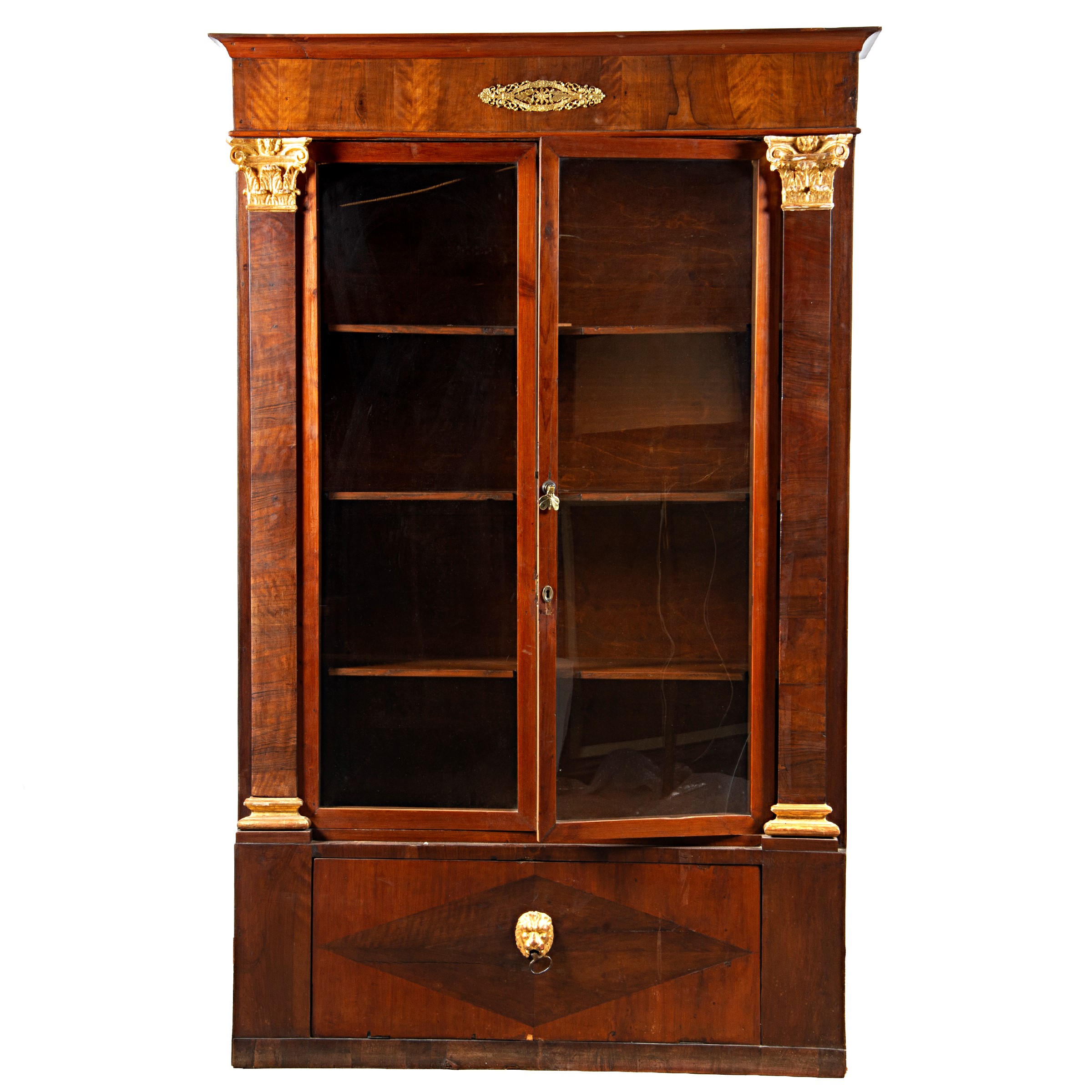 in noce, con laterali a capitelli dorati, due sportelli con vetri ed uno sportelli a ribalta, un cassetto, cm L130xP40xH214